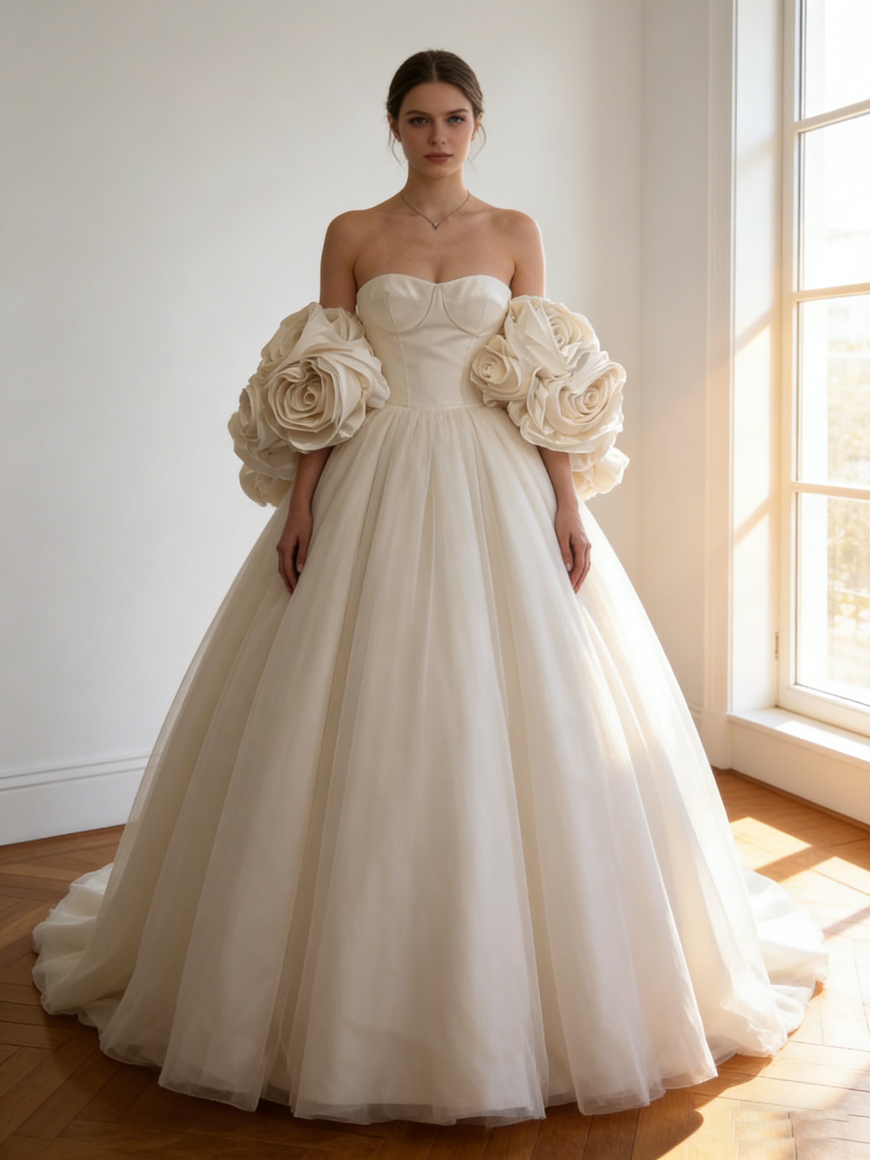 ウエディングドレス オフホワイト 取り外し可能な付け袖 華やかなトレーン アンティークなドレス ブライダル