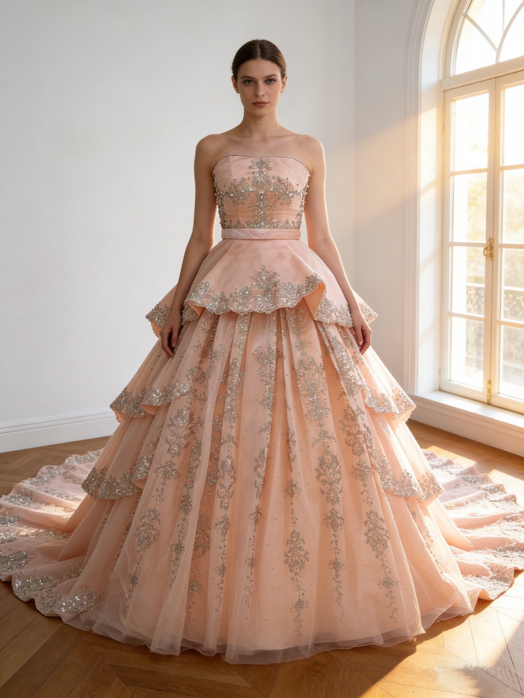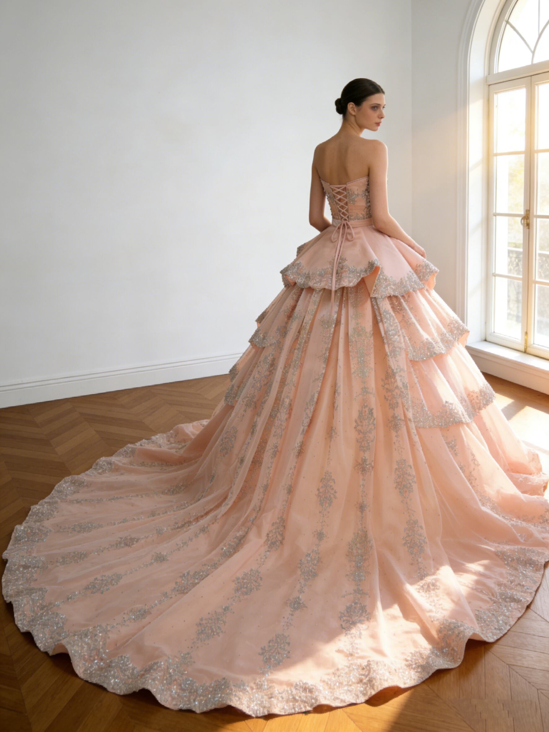 カラードレス ピンク ビスチェドレス キラキラ光る刺繍 レイヤードドレス 華やかなトレーン ブライダル