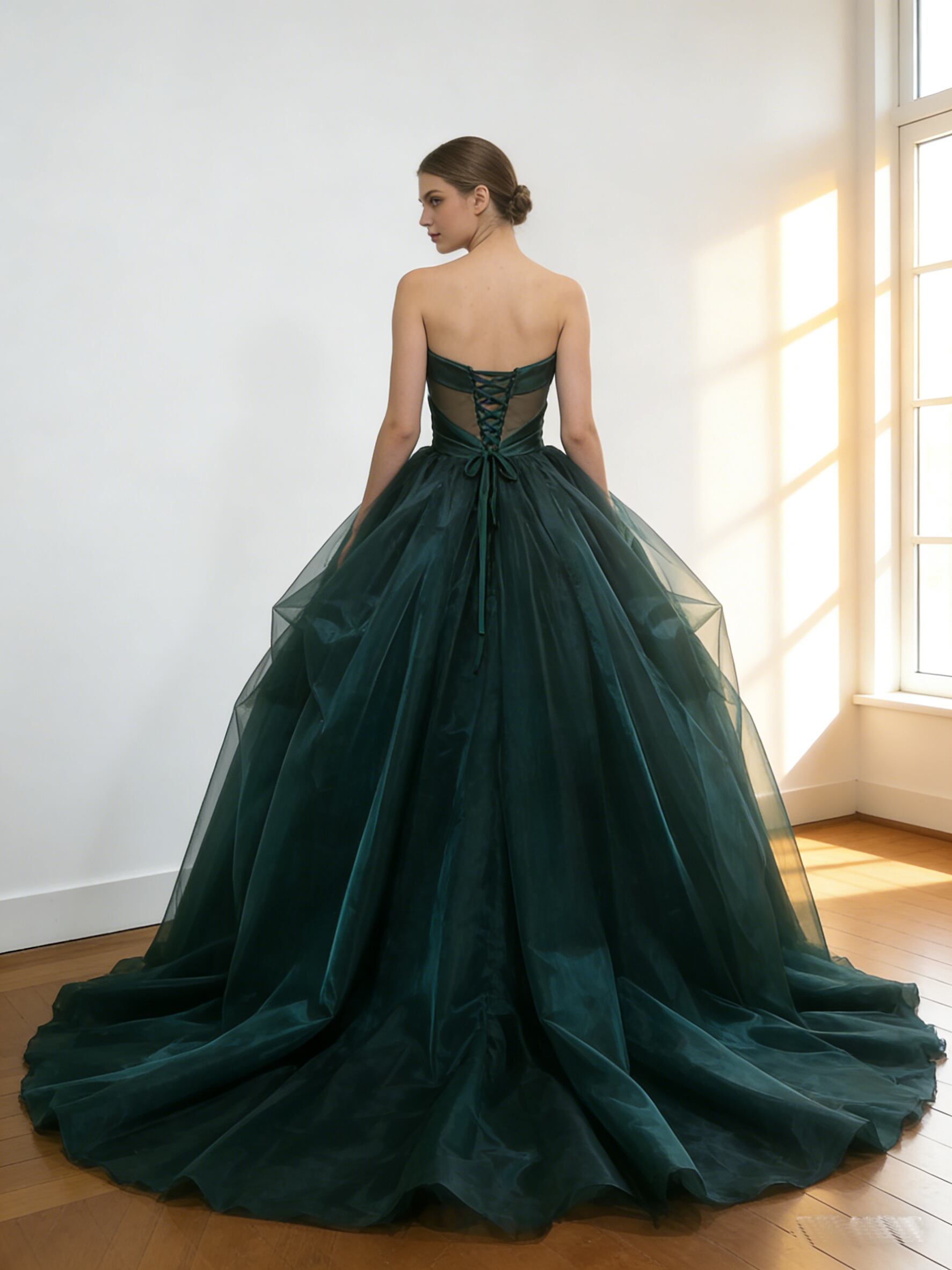 カラードレス 深緑 スリット ソフトチュール 華やかなトレーン ビスチェドレス 色直し 結婚式 前撮り