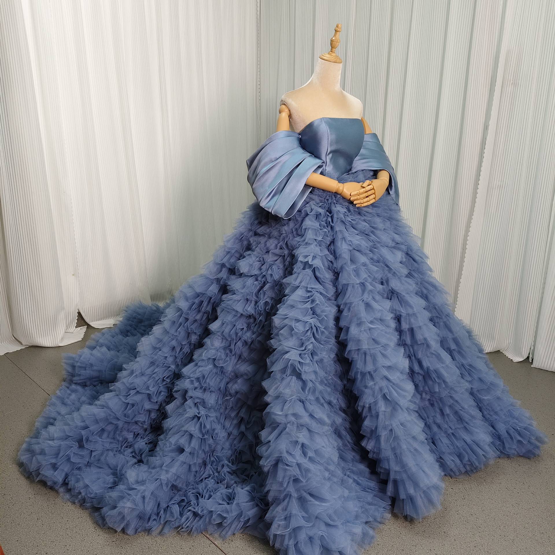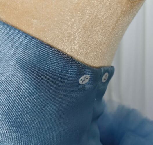 カラードレス ブルー もこもこドレス 取り外し可能な付け袖 ミカドサテン 華やかなトレーン 結婚式