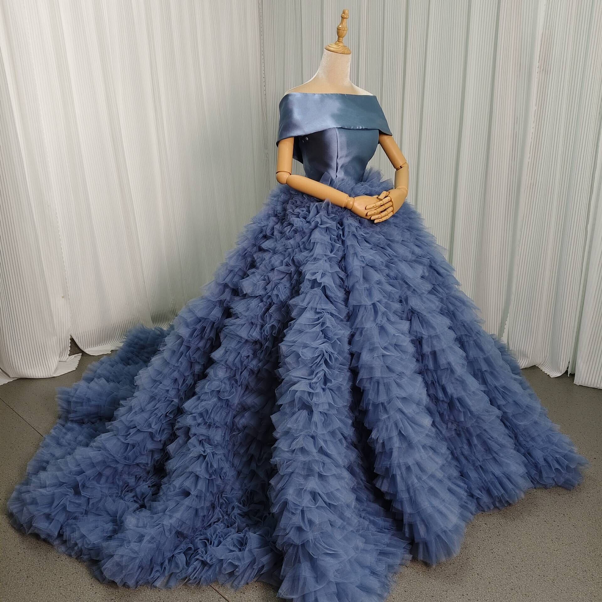 カラードレス ブルー もこもこドレス 取り外し可能なオフショルダー ミカドサテン 華やかなトレーン 結婚式