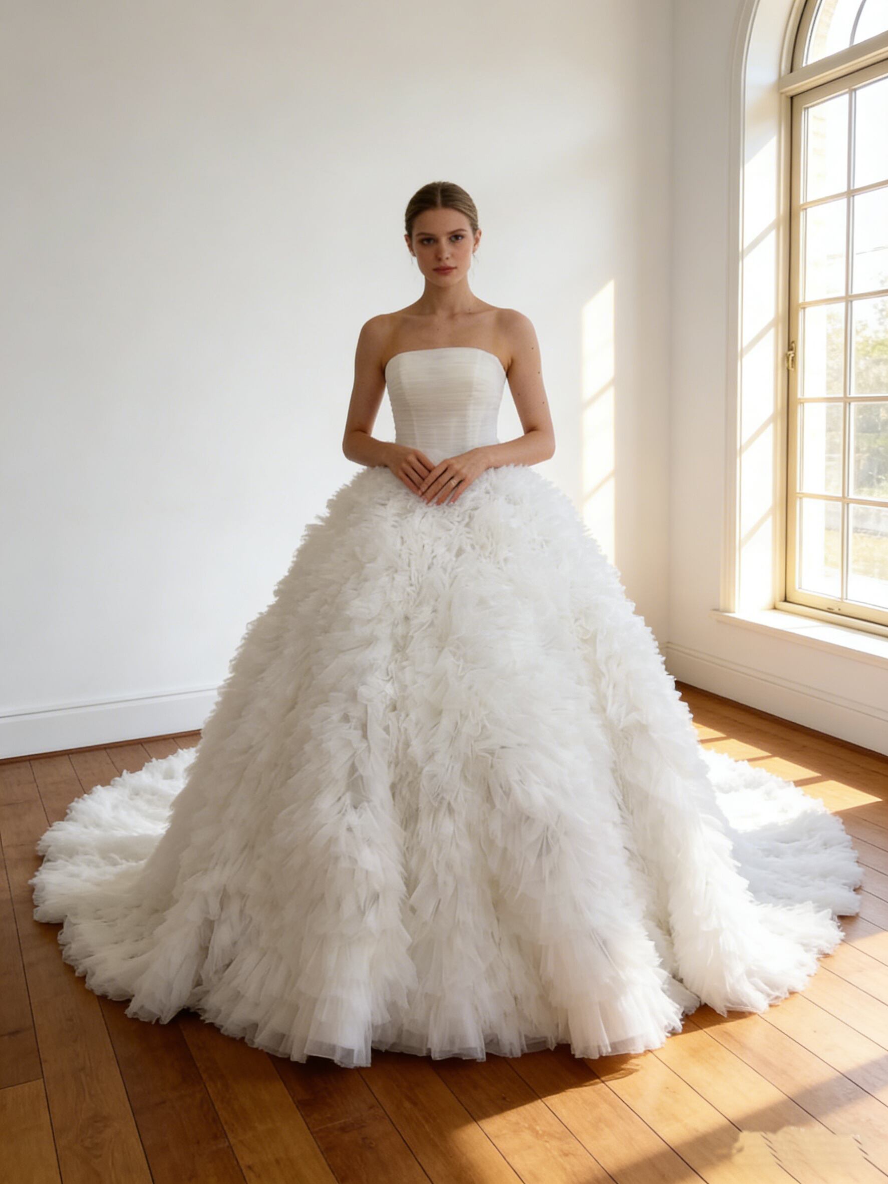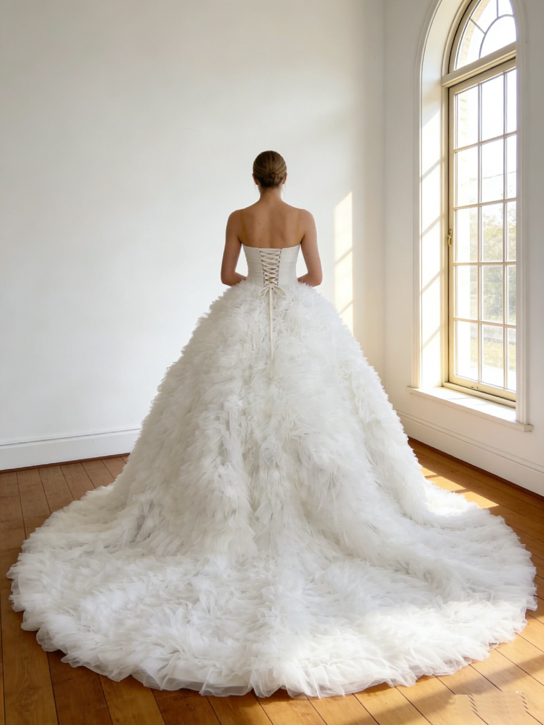 ウエディングドレス オフホワイト ビスチェドレス フリルドレス 華やかなトレーン 編み上げ 披露宴/結婚式