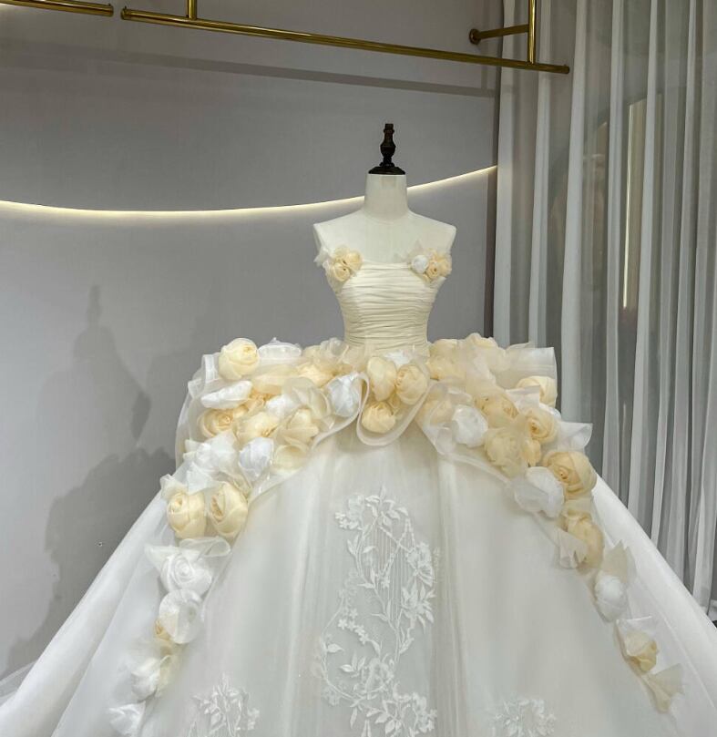ウエディングドレス オフホワイト バラトレーン 繊細なレース 韓国風ドレス 編み上げ 華やかなトレーン 結婚式