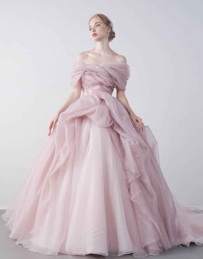 カラードレス ピンク 取り外し可能なオフショルダー 上質オーガンジー レイヤードドレス 華やかなトレーン 花嫁