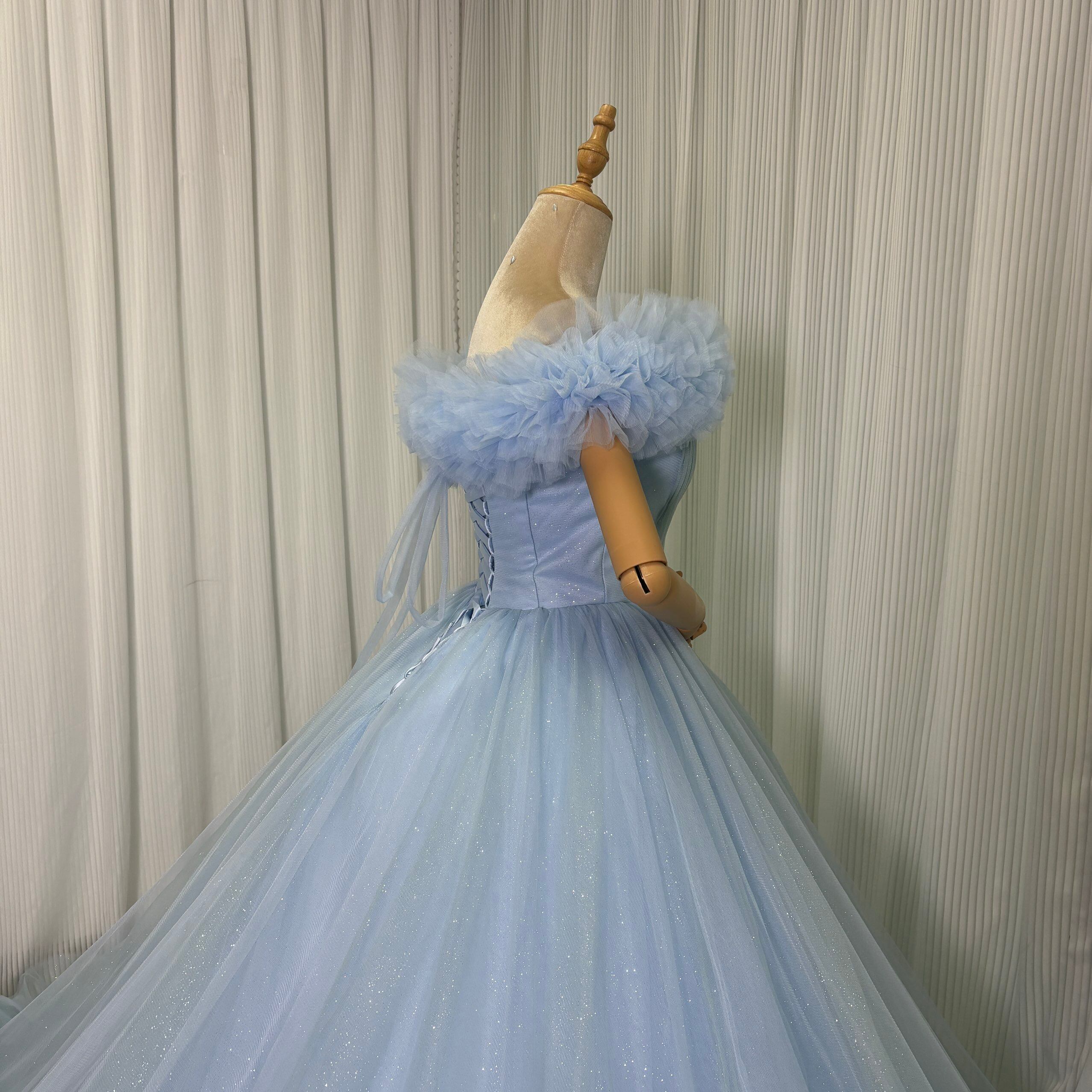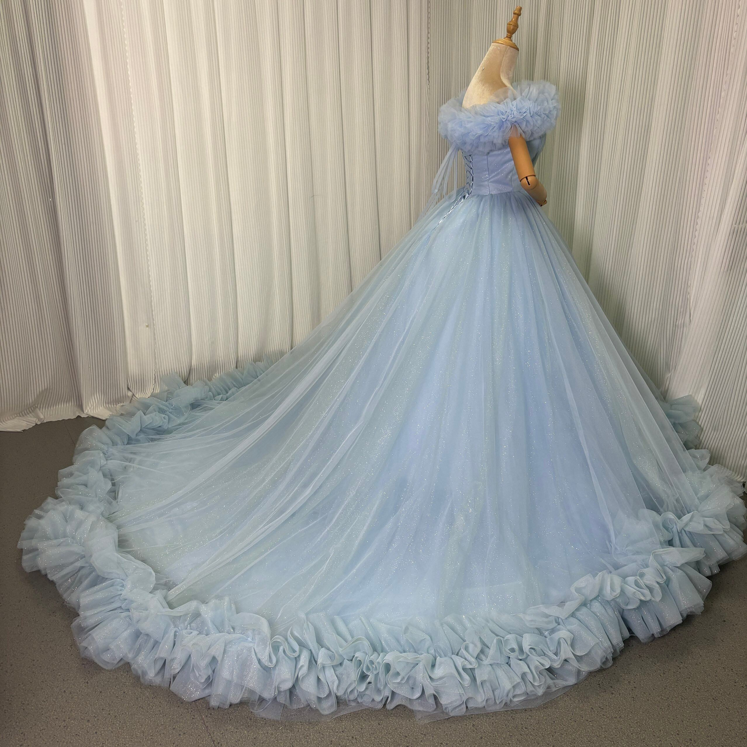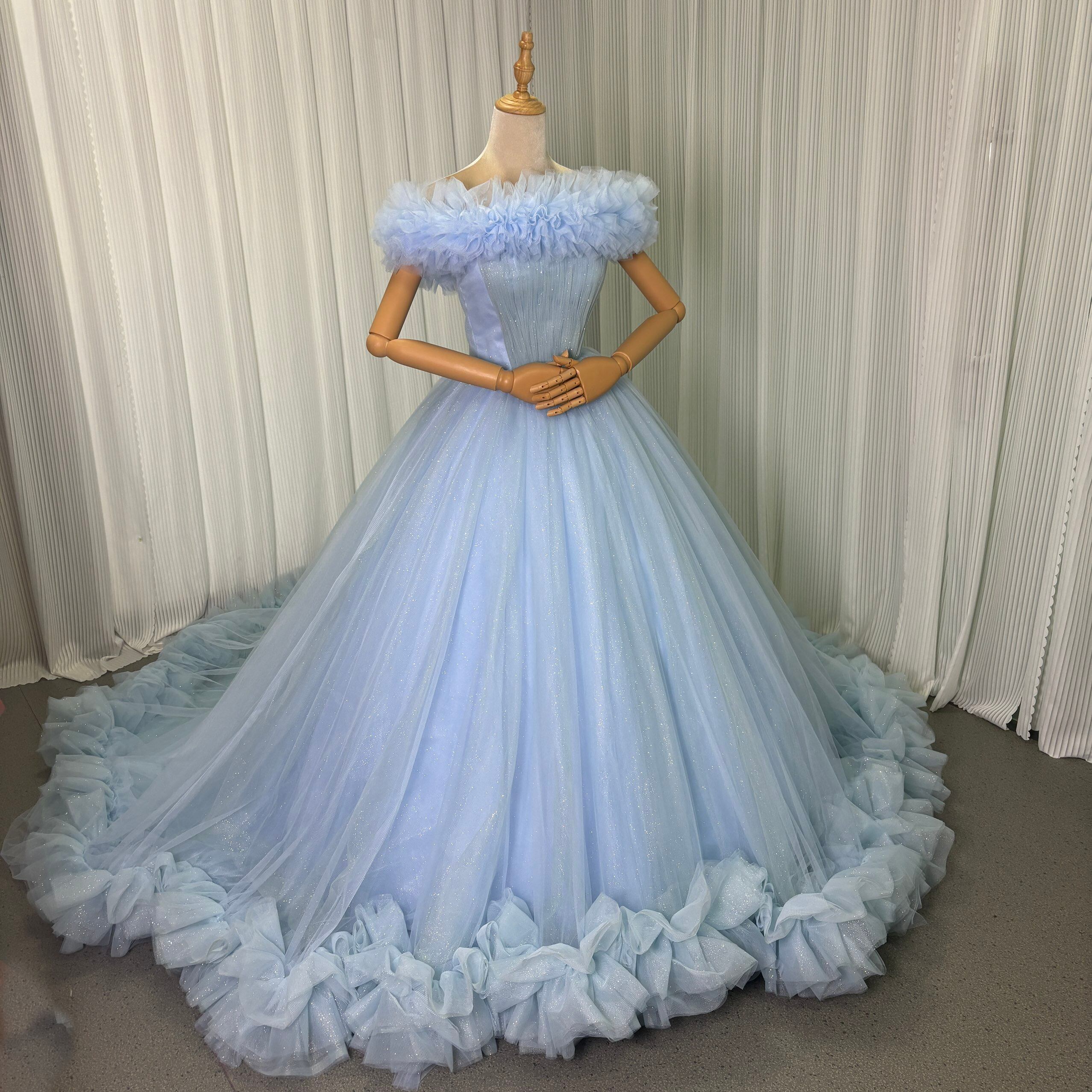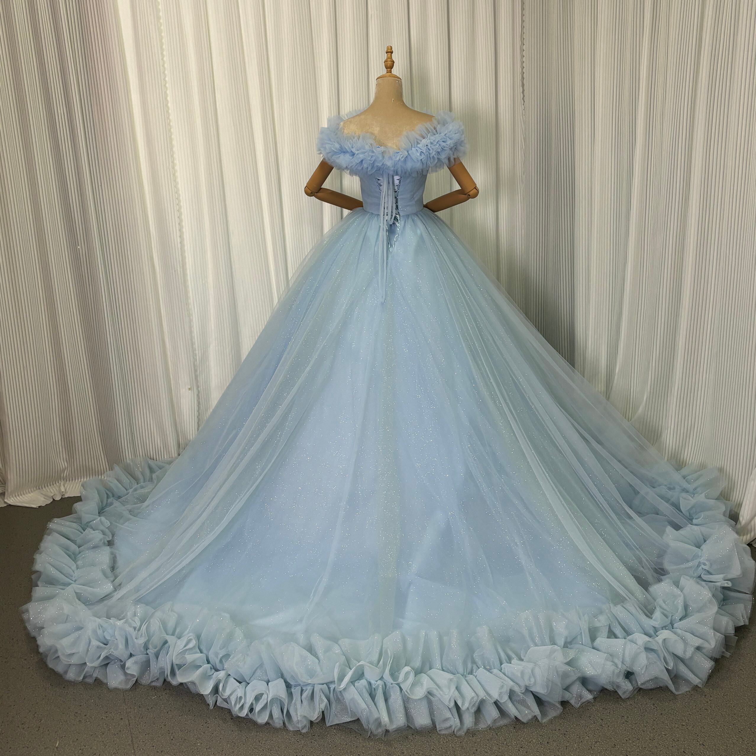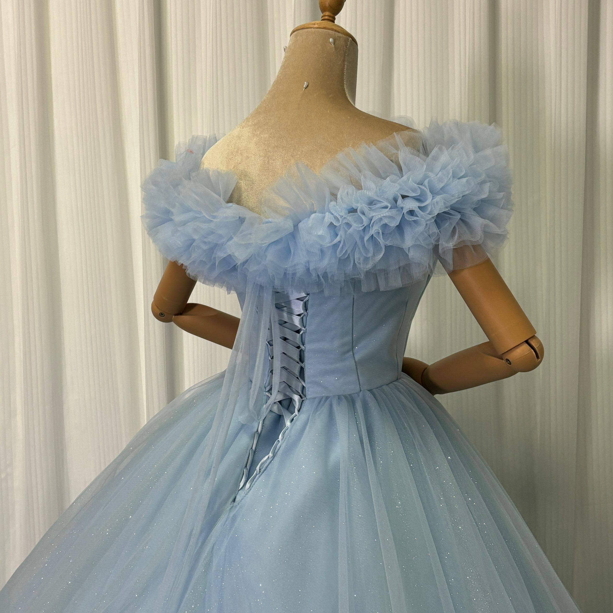 カラードレス ブルー+グリーン シークインチュール 取り外し可能なオフショルダー ボリュームドレス 華やかなトレーン 結婚式