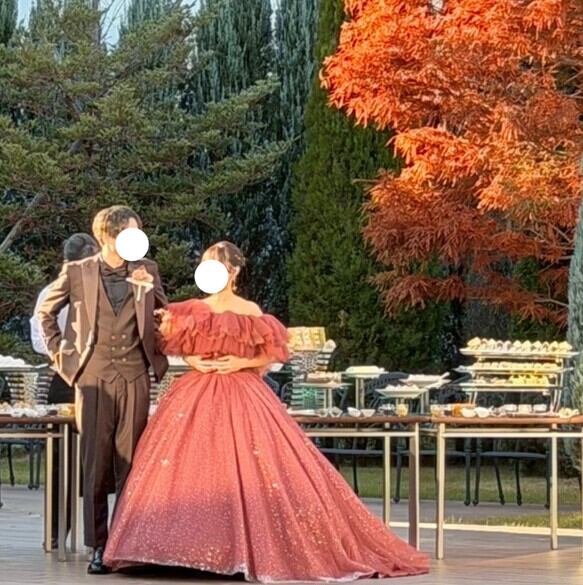 実例写真! カラードレス ボルドー色 オフショルダー キラキラスパンコール 華やかなトレーン 結婚式 前撮り