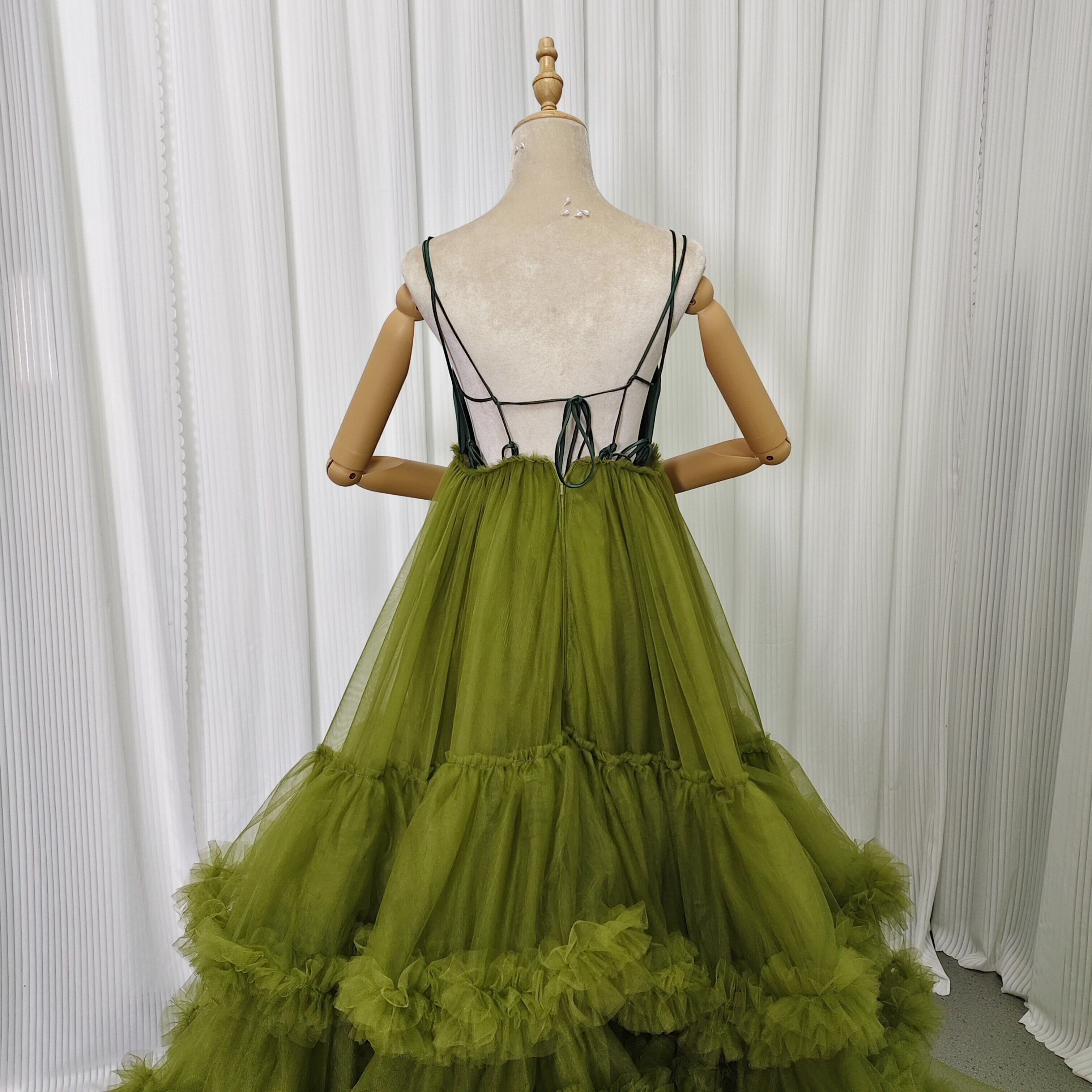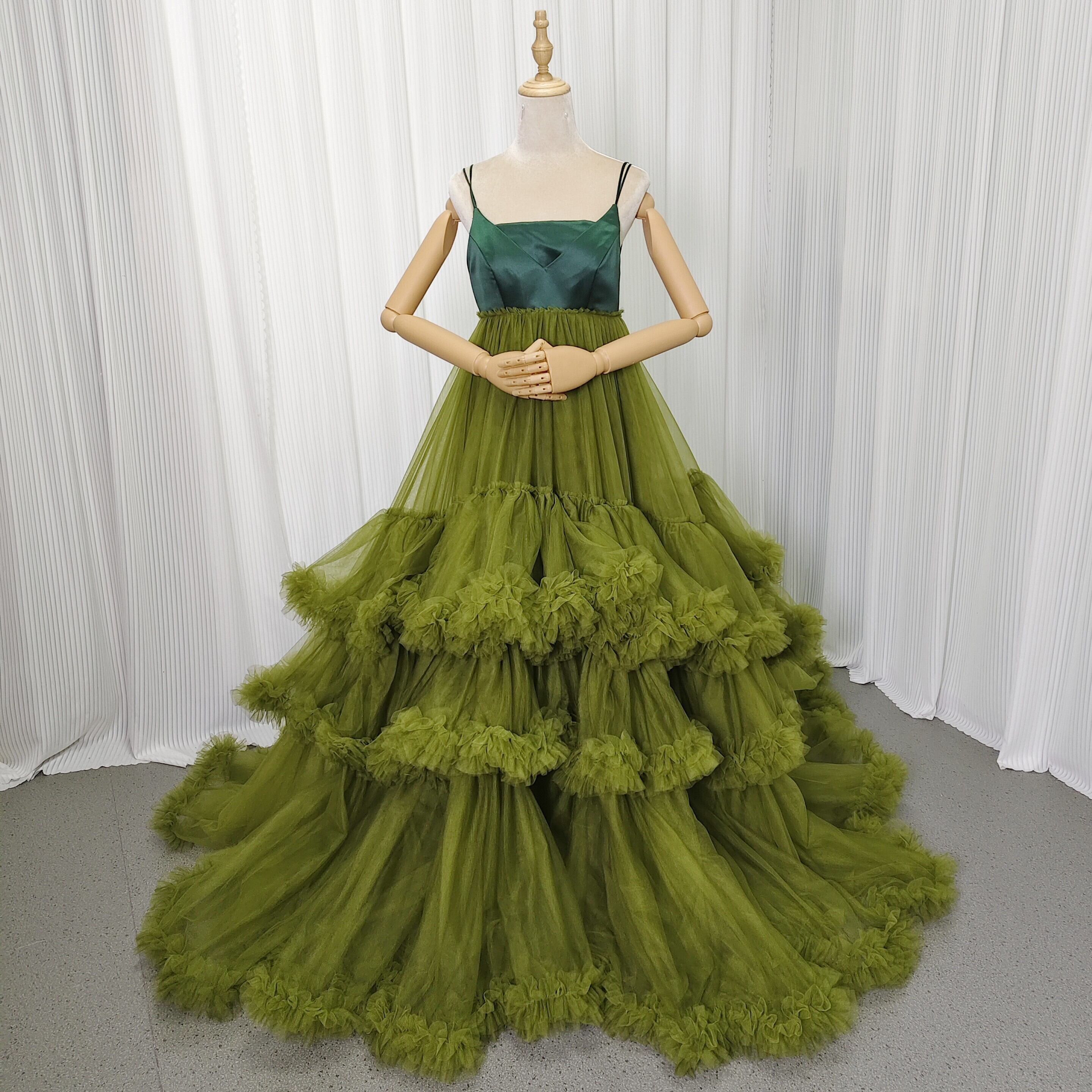 カラードレス 深緑 光沢サテン+ソフトチュール キャミソール ボリュームドレス 結婚式 前撮り