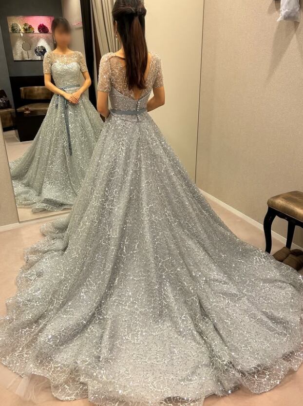 カラードレス シルバーグレー 短袖 サッシュベルト キラキラ光る刺繍 くるみボタン+ ファスナー 韓国風ドレス 華やかなトレーン 結婚式