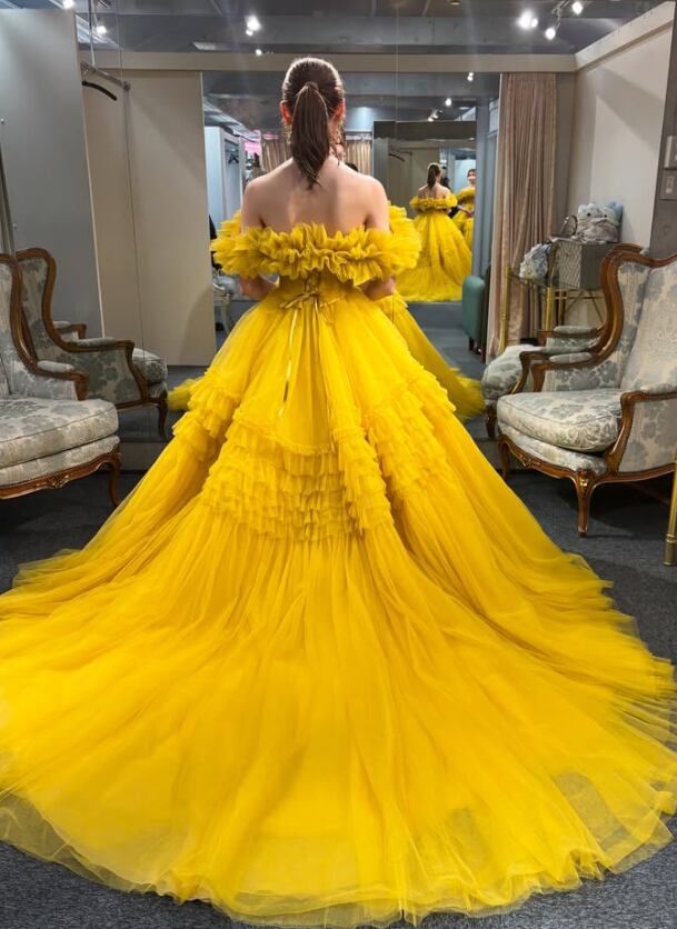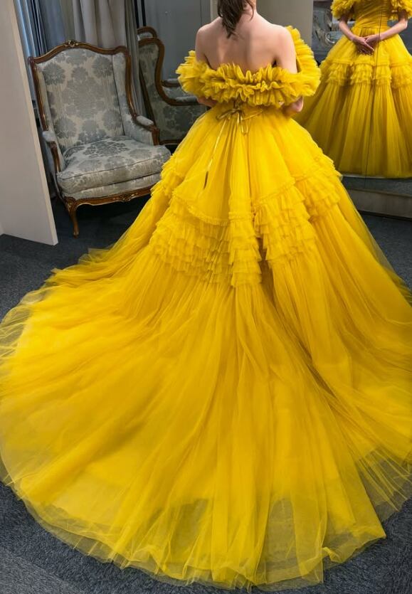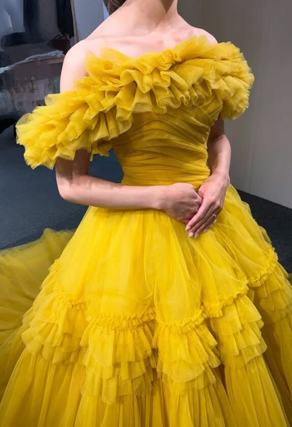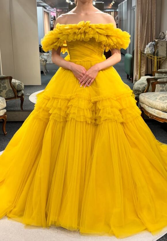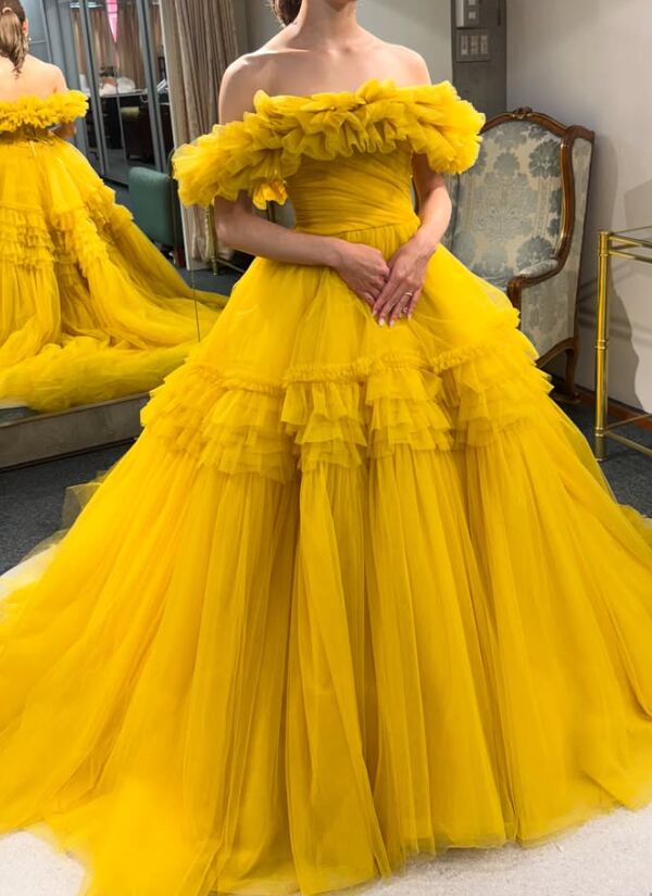 カラードレス うこんいろ オフショルダー 編み上げ ソフトチュール 色直し 華やかなトレーン 目立つ 花嫁 前撮り