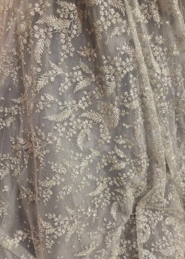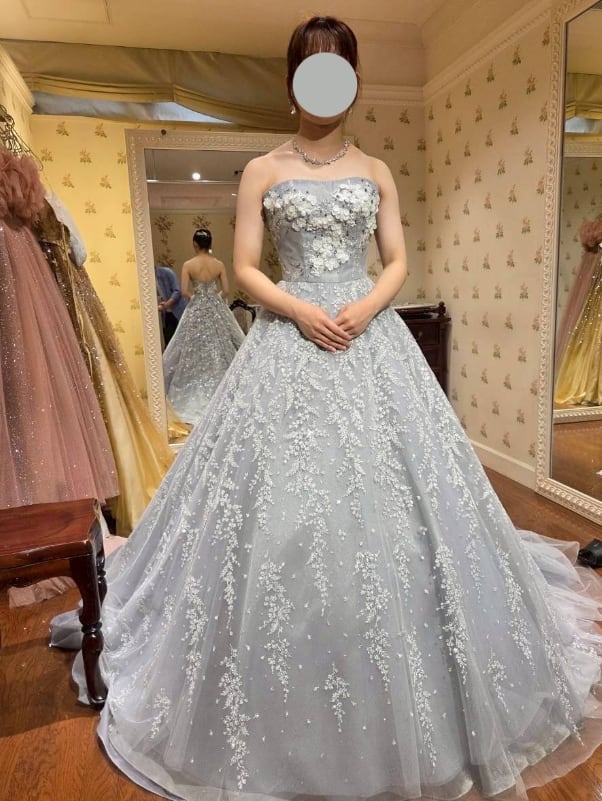 カラードレス ブルーグレー キラキラ光る刺繍 3D立体レース刺繍 韓国風ドレス ファスナー 華やかなトレーン ビスチェドレス 花嫁 前撮り