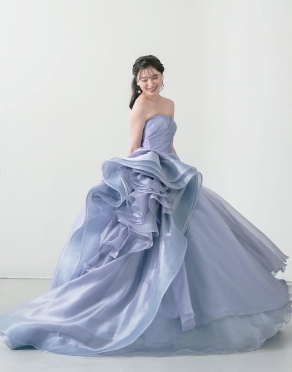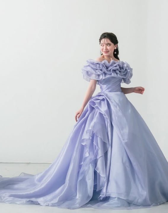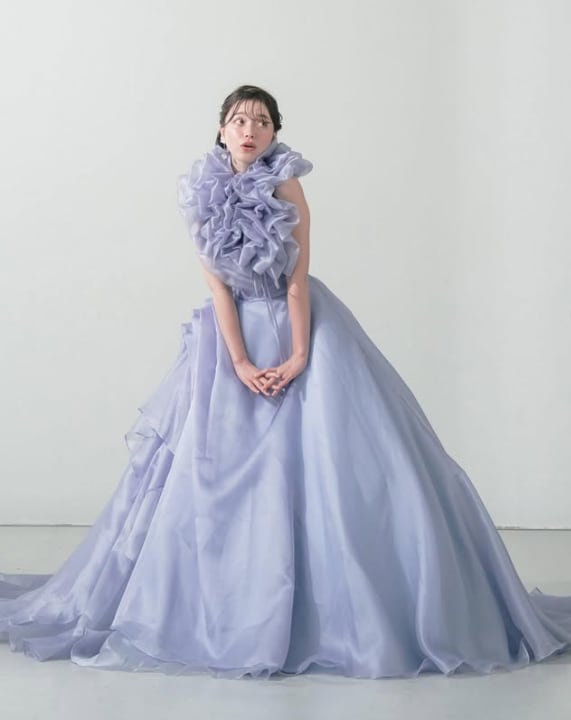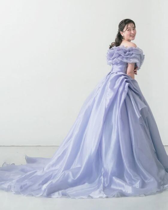 カラードレス 爽やかで優しいブルー 取り外し可能なオフショルダー 2WAYの着方 上質オーガンジー ラッフルフリル 華やかなトレーン 花嫁