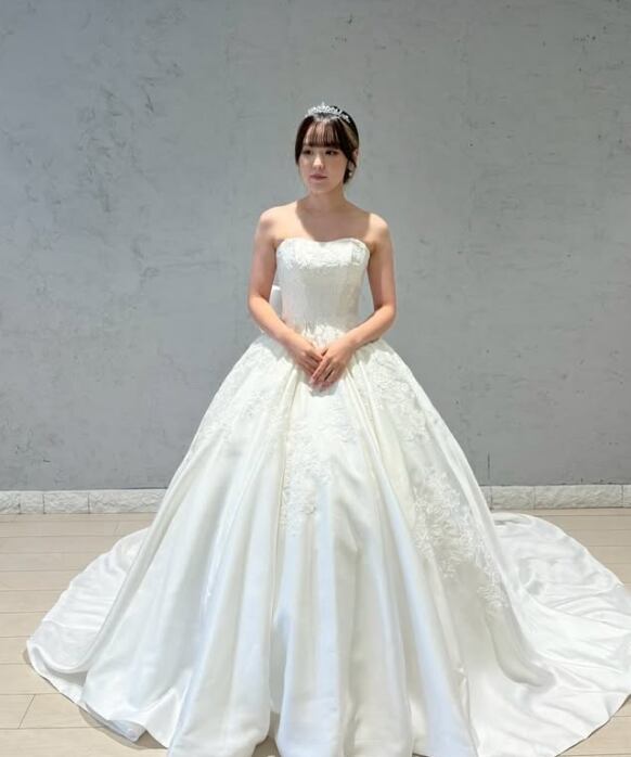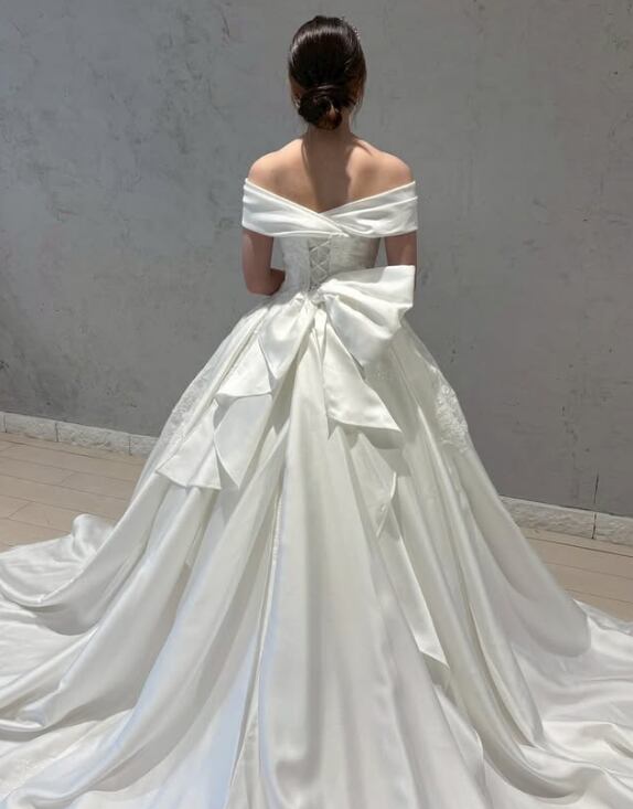 ウエディングドレス オフホワイト 取り外し可能なオフショルダー ふっくら柔らかなバックリボン 繊細なレース 華やかなトレーン 結婚式