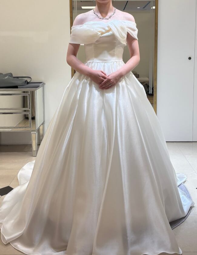 ウエディングドレス オフホワイト オフショルダー 上質オーガンジー 華やかなトレーン ブライダル 結婚式