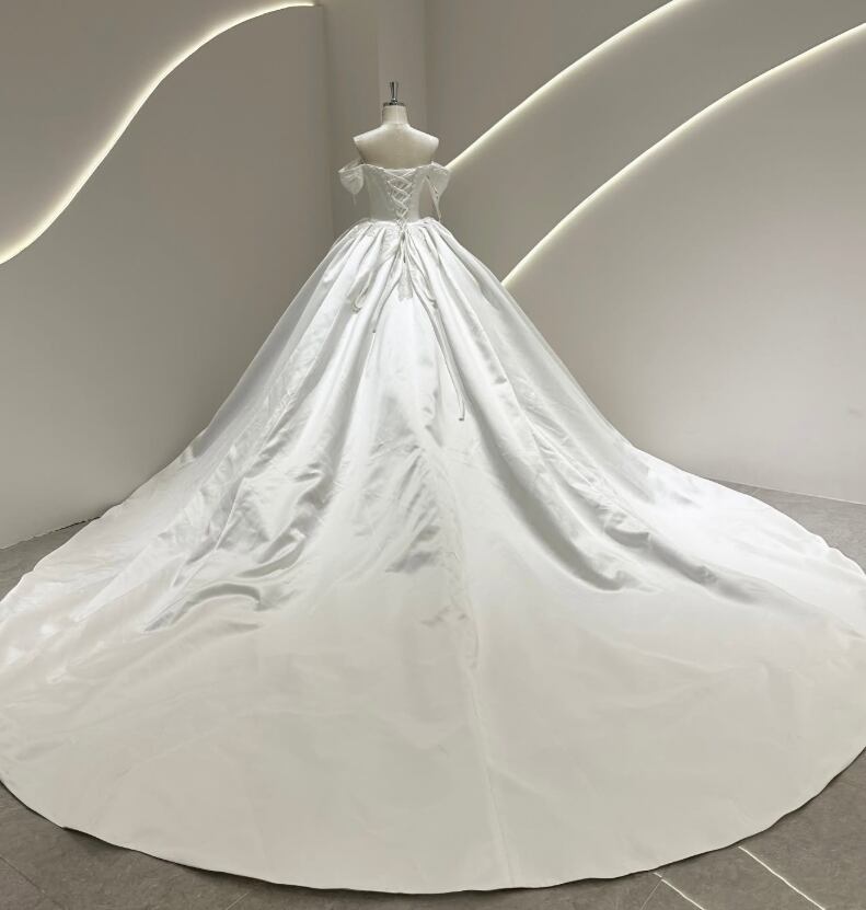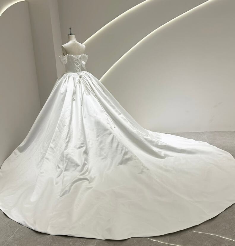 ウエディングドレス オフホワイト オフショルダー キラキラ光る刺繍 光沢サテン 韓国風ドレス 華やかなトレーン 結婚式