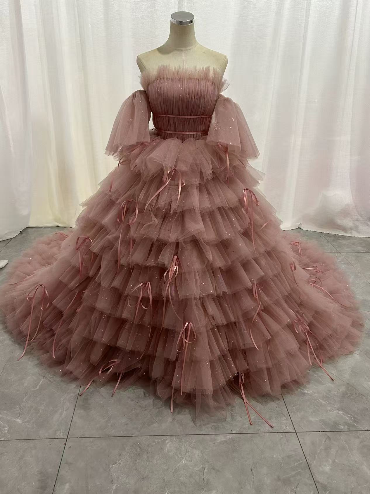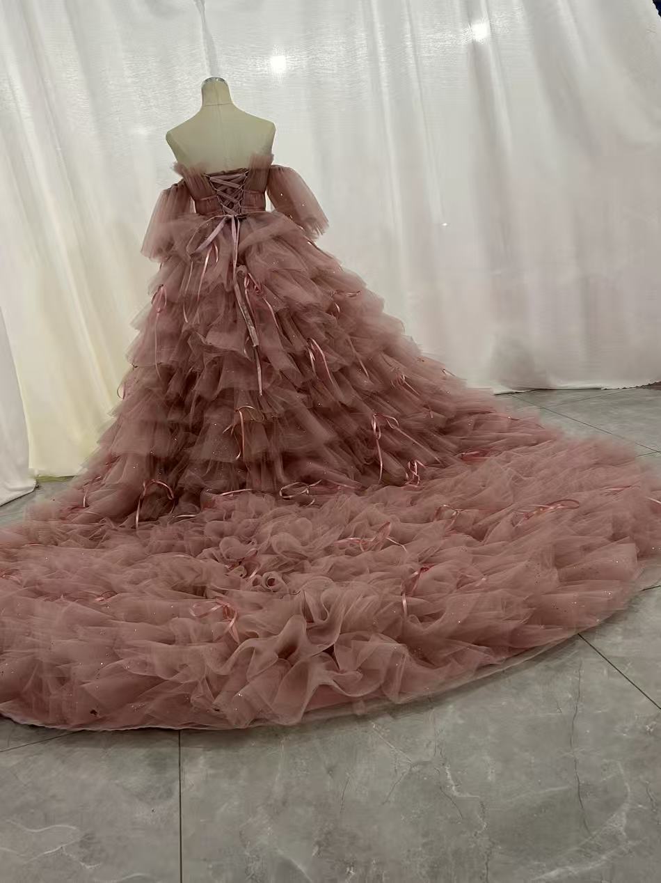 カラードレス ピンク シークインチュール リボン 華やかなトレーン 編み上げ 柔らかく重ねたチュールスカート 結婚式