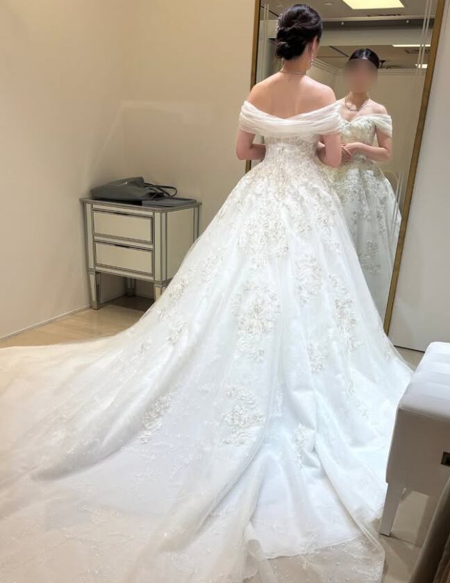 ウエディングドレス オフホワイト オフショルダー 花柄モチーフで刺繍が美しい シークインチュール 華やかなトレーン 結婚式