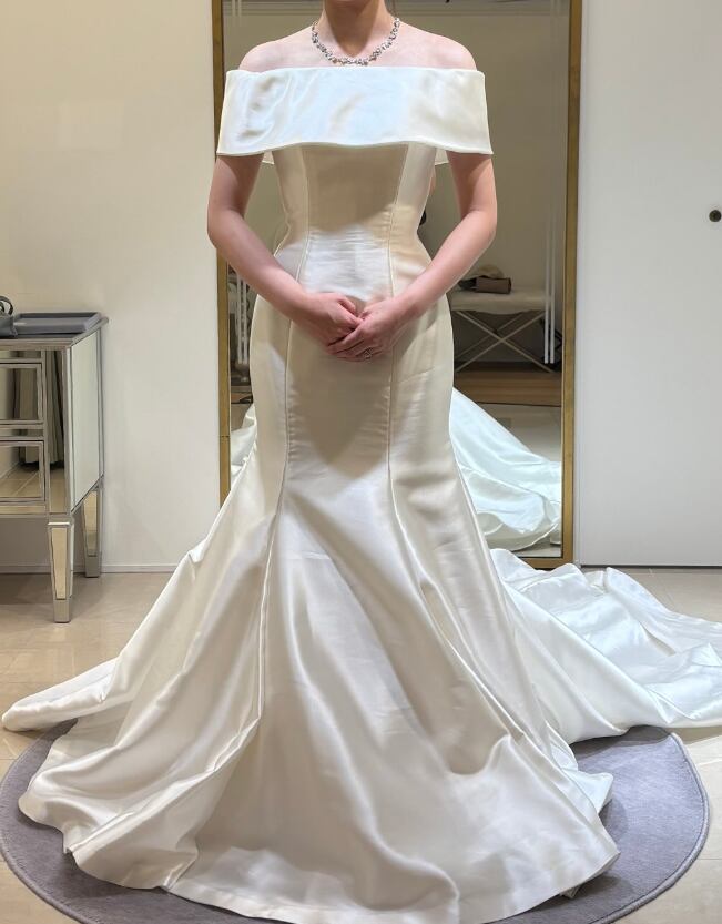 ウエディングドレス オフホワイト 光沢サテン 取り外し可能なオフショルダー ソフトマーメイドライン 華やかなトレーン 結婚式