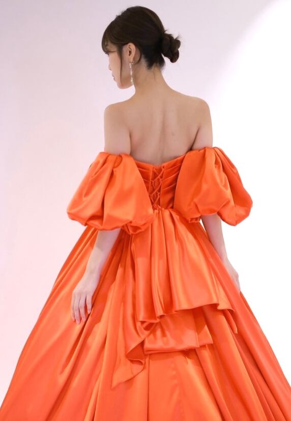 カラードレス オレンジ 取り外し可能な付け袖 光沢サテン 編み上げ 華やかなトレーン 花嫁 前撮り