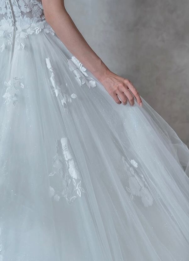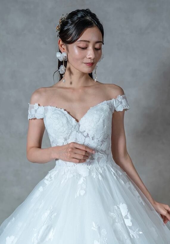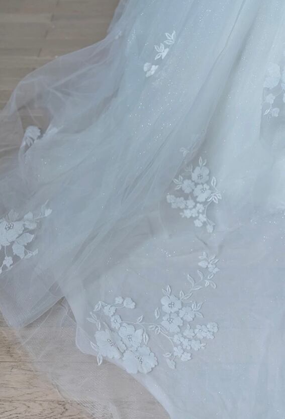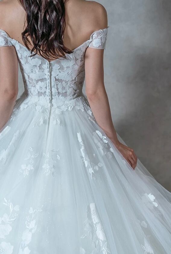 ウエディングドレス オフホワイト オフショルダー キラキラグリッターチュール ファスナー 華やかなトレーン 結婚式
