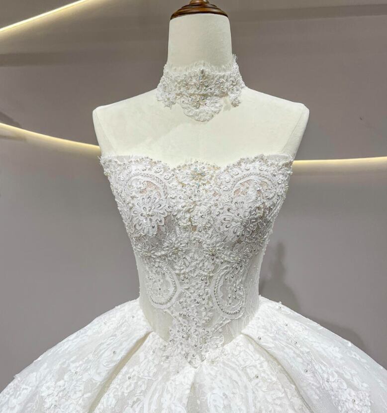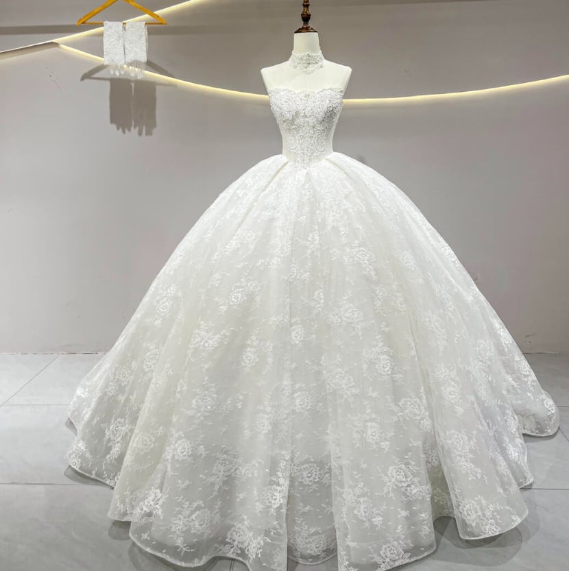 ウエディングドレス オフホワイト 贅沢な総レース チョーカー 編み上げ 華やかなトレーン ビスチェドレス 韓国風ドレス 結婚式