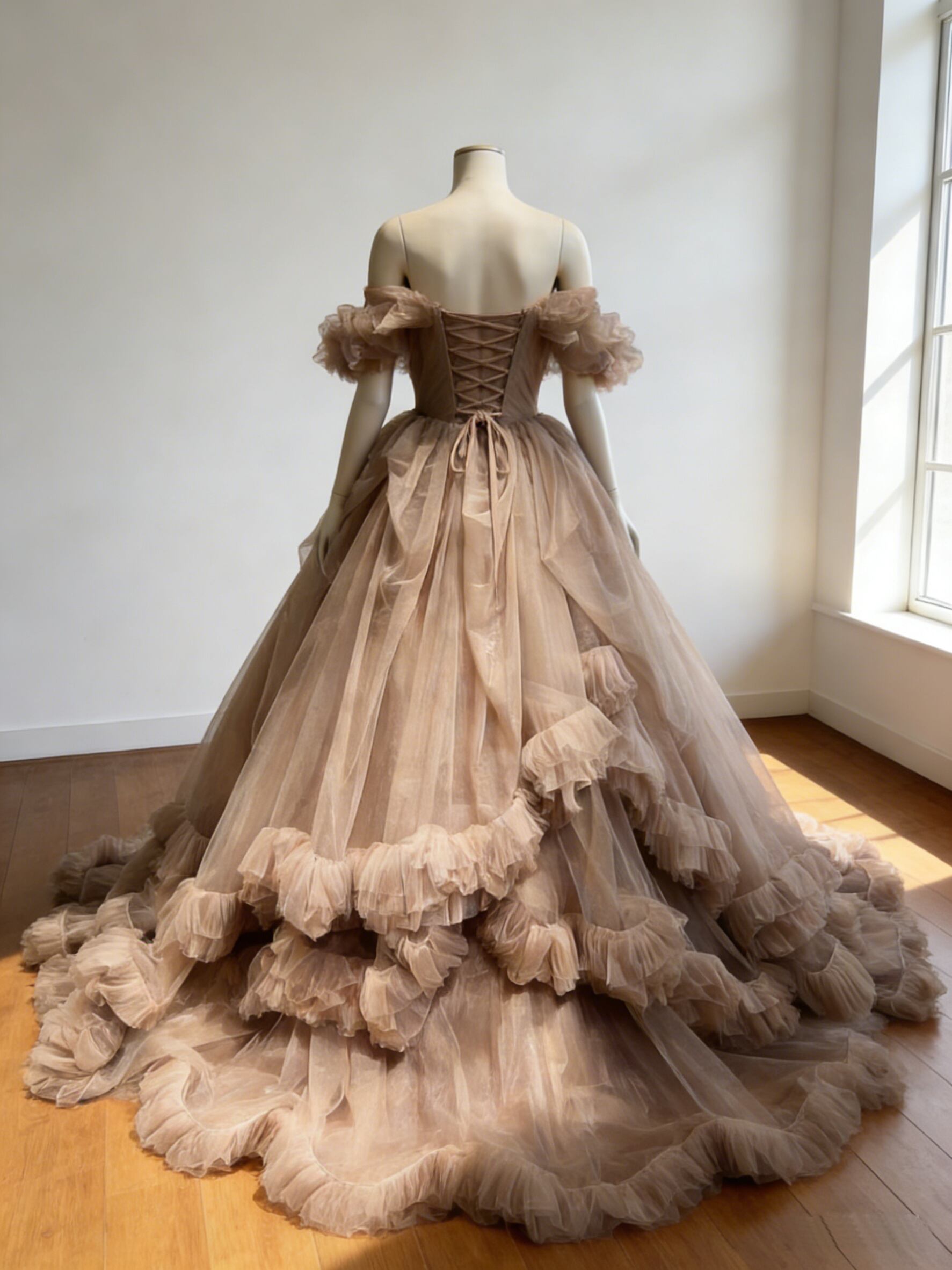 カラードレス ブラウン オフショルダー ボリュームドレス 編み上げ 華やかなトレーン 花嫁 前撮り