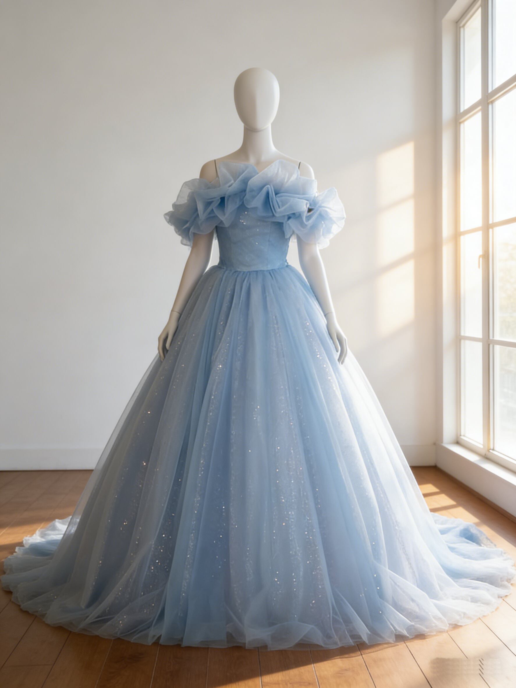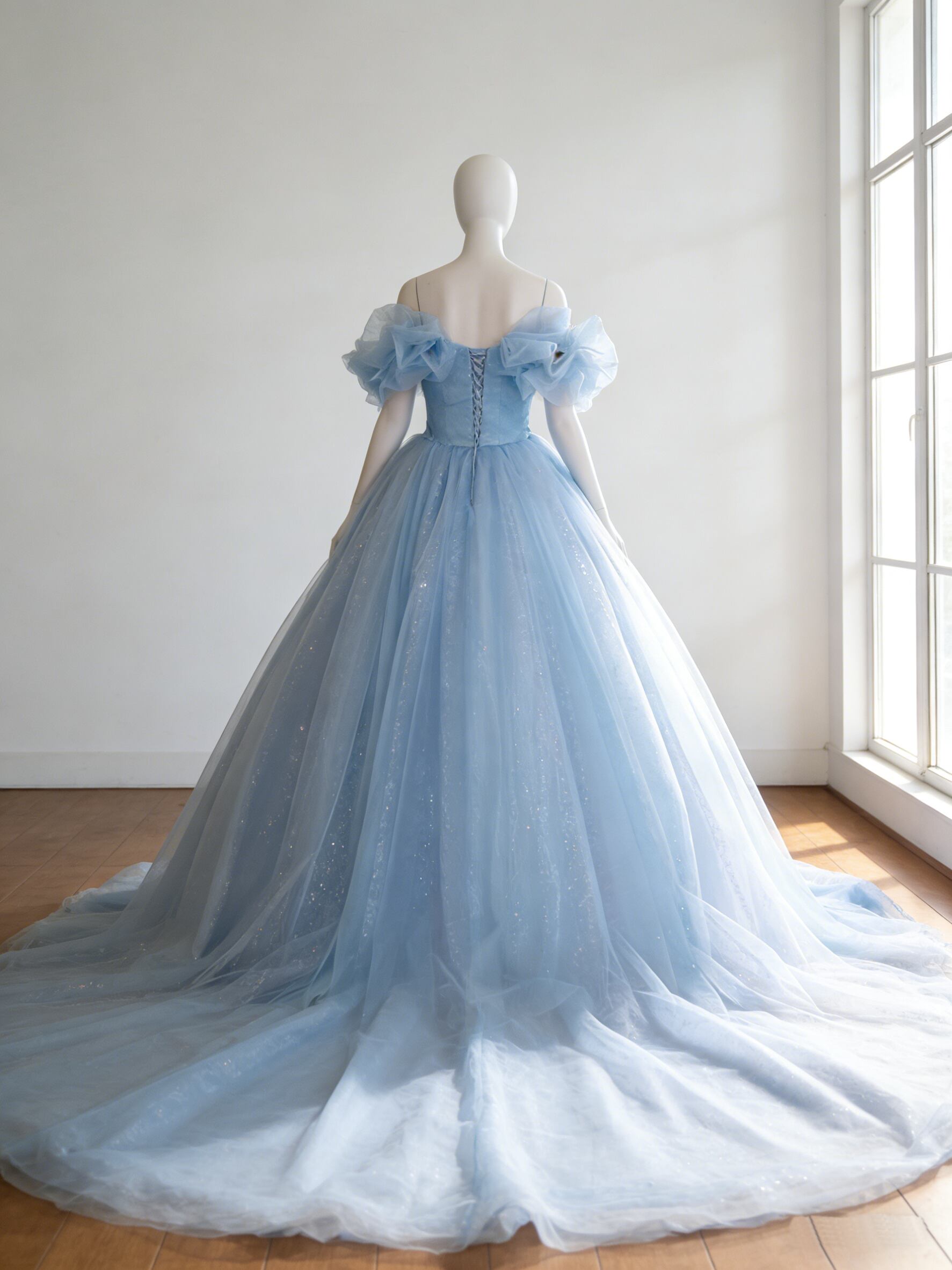 カラードレス 爽やかで優しいブルー オフショルダー シークインチュール 華やかなトレーン 結婚式 前撮り