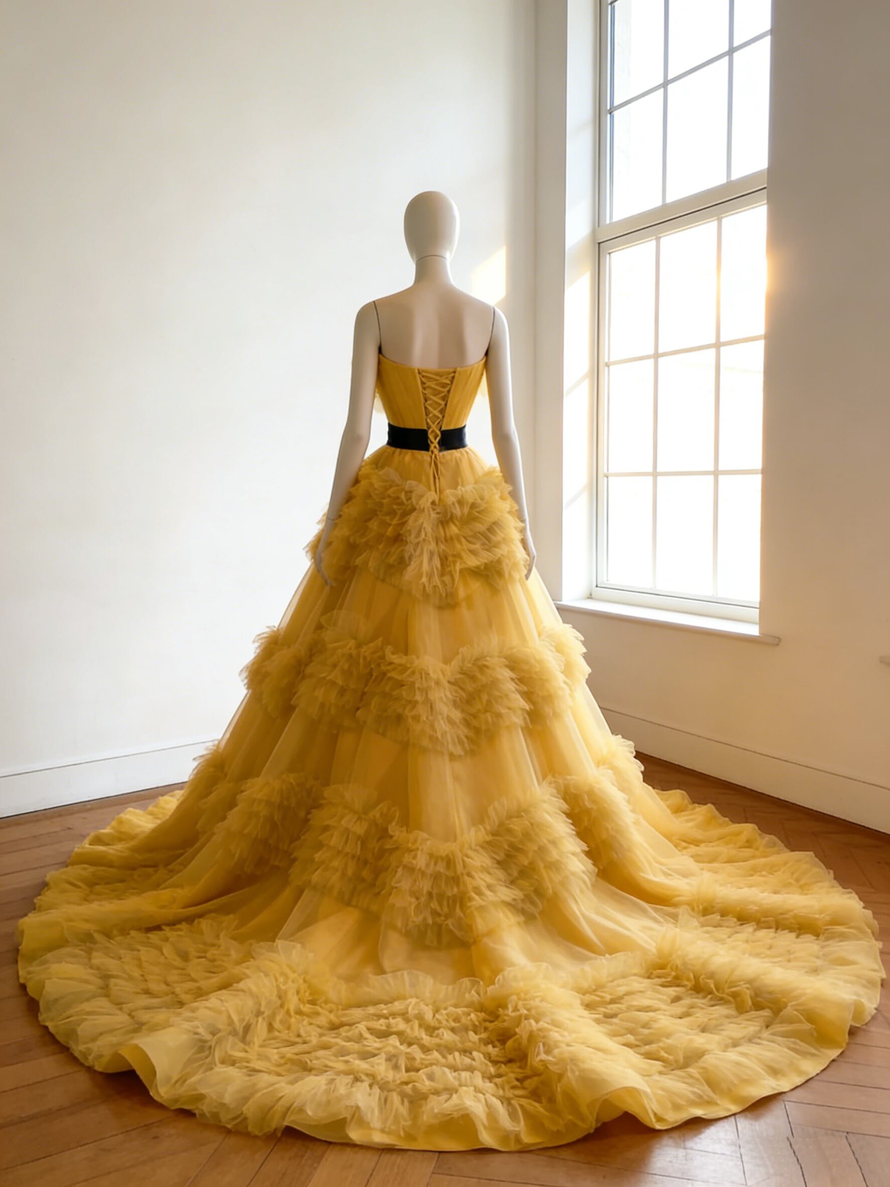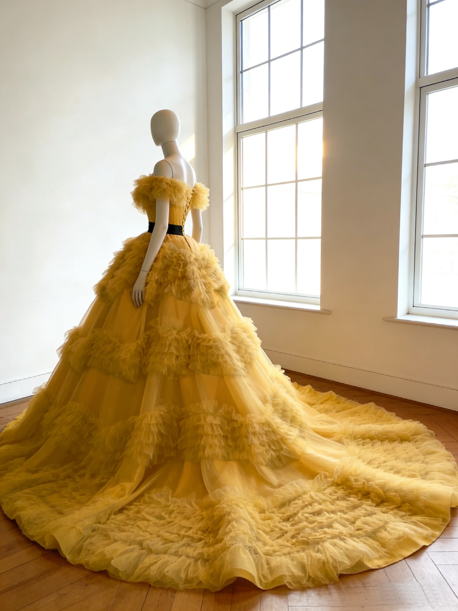 カラードレス うこんいろ スリット 取り外し可能なオフショルダー 編み上げ 華やかなトレーン 結婚式