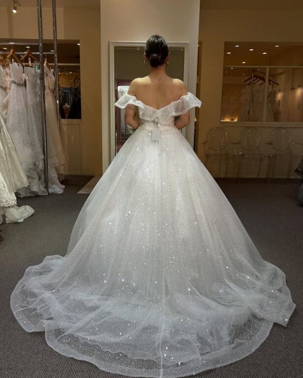 ウエディングドレス オフホワイト オフショルダー 韓国風ドレス シークインチュール 華やかなトレーン 憧れのドレス 結婚式