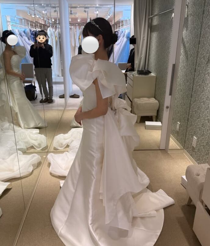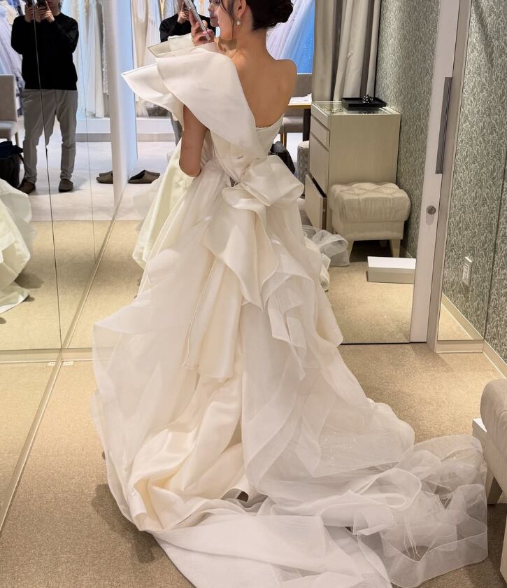 ウエディングドレス オフホワイト ショルダー型 シークインチュール ソフトマーメイドライン 華やかなトレーン 結婚式