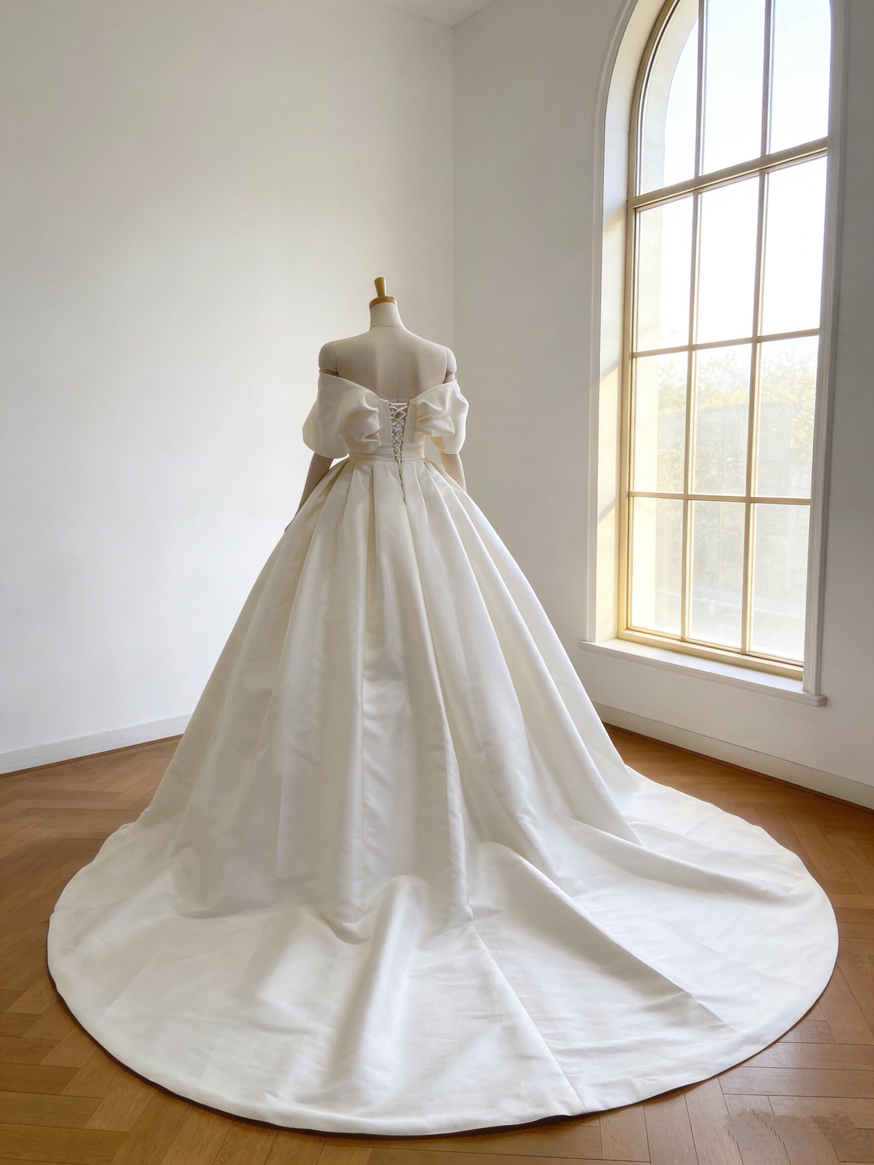 ウエディングドレス オフホワイト 光沢サテン オフショルダー 編み上げ 華やかなトレーン 結婚式