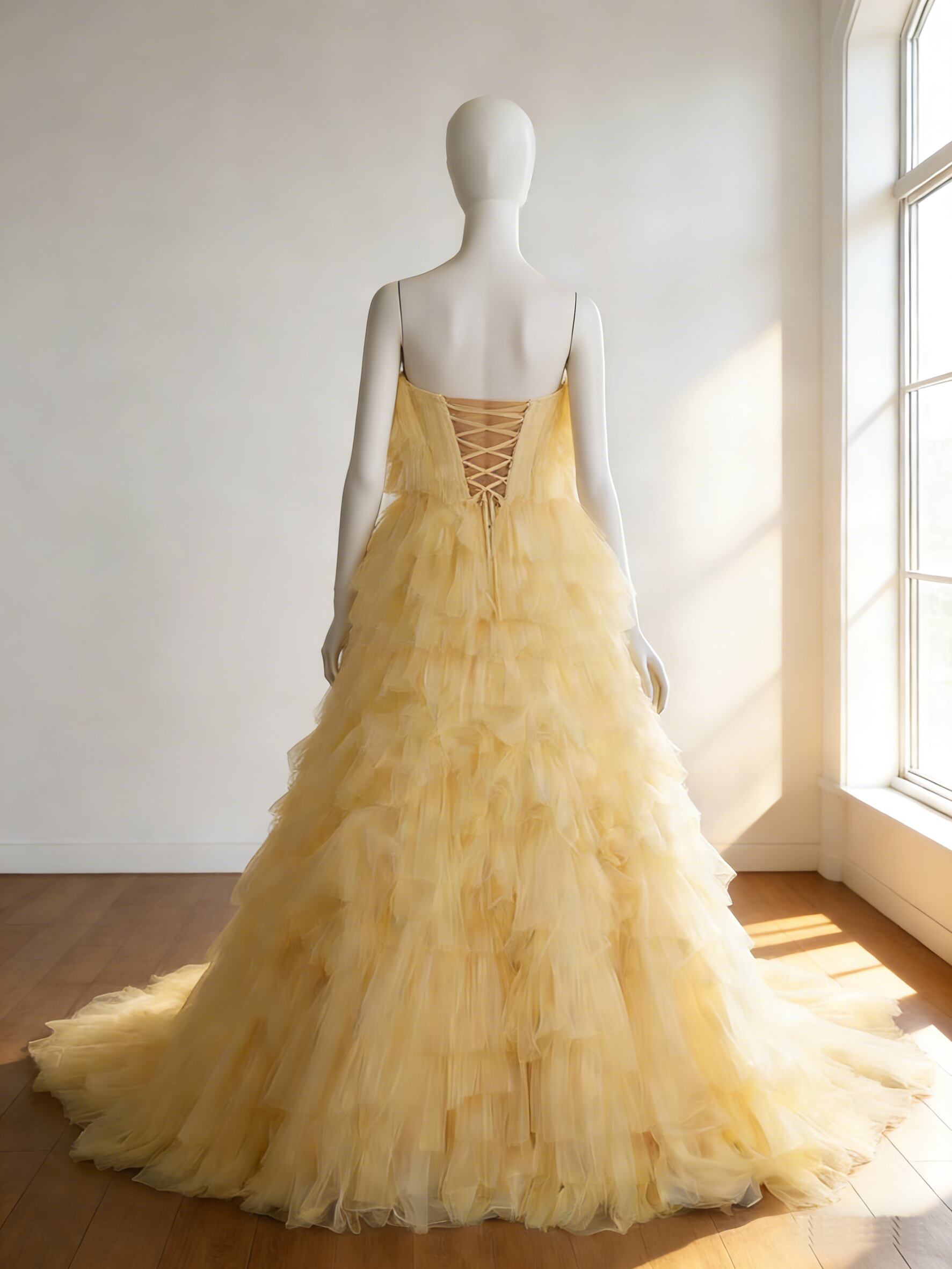 カラードレス 黄色い 柔らかく重ねたチュールスカート 編み上げ トレーン もこもこドレス ビスチェドレス 結婚式