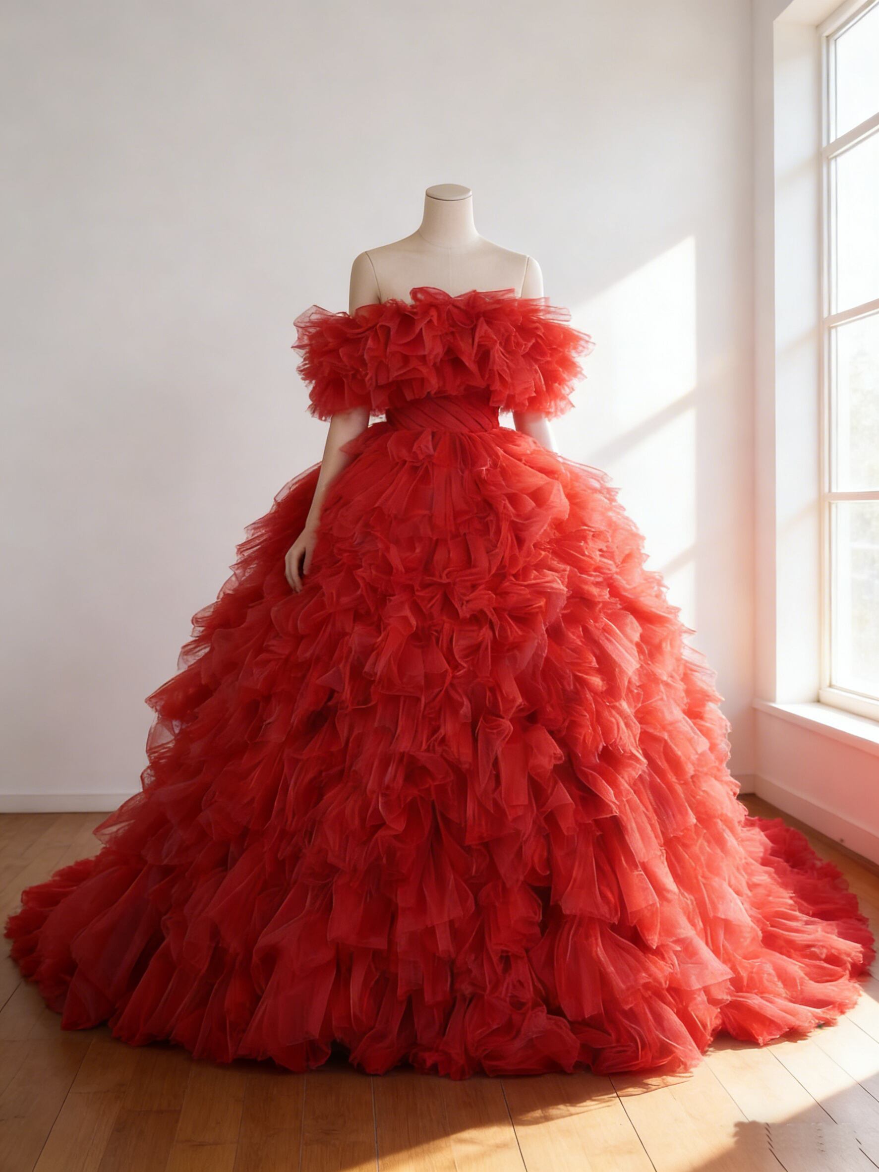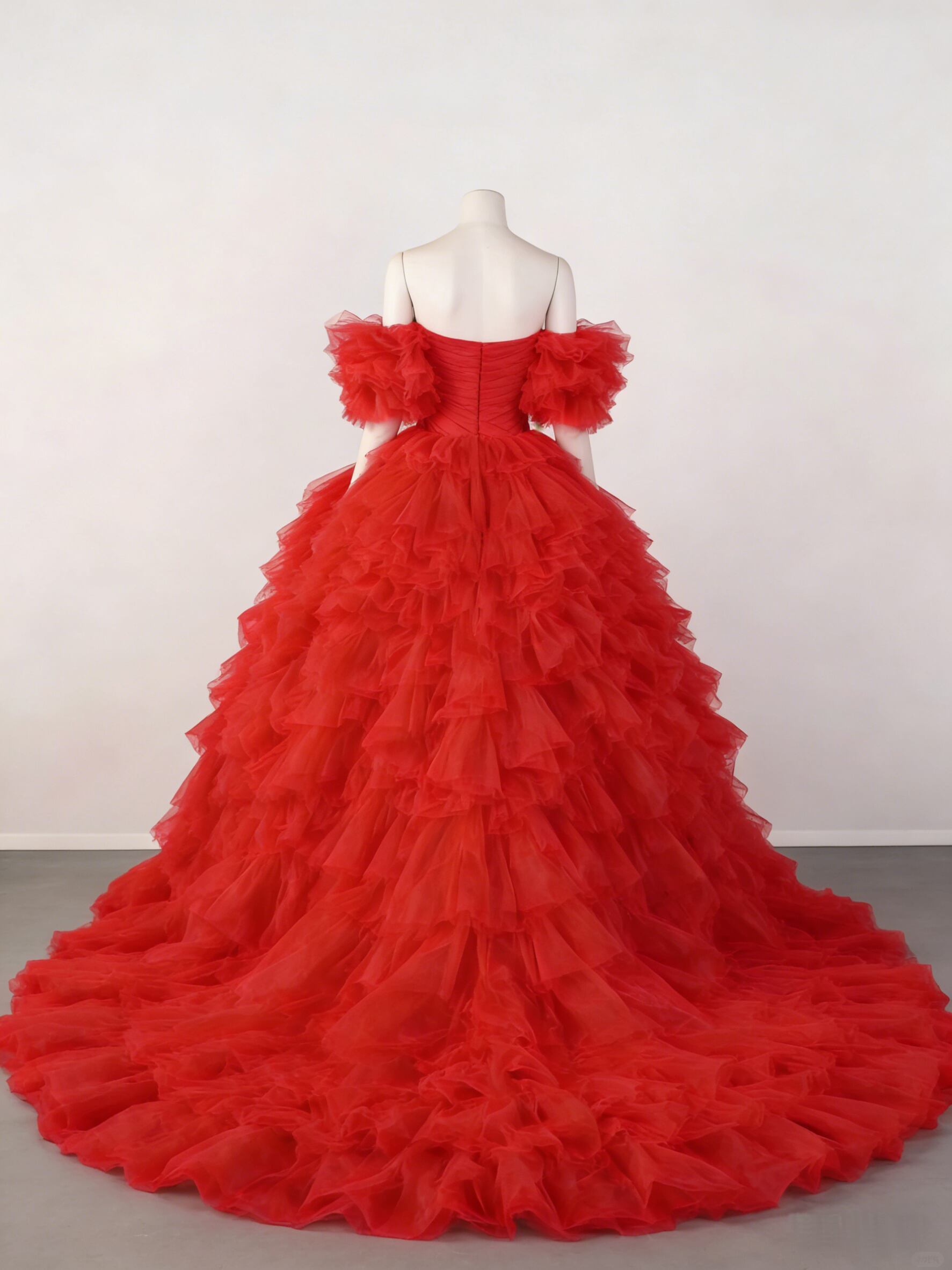 カラードレス ボルドー色 もこもこドレス オフショルダー 華やかなトレーン 結婚式 前撮り