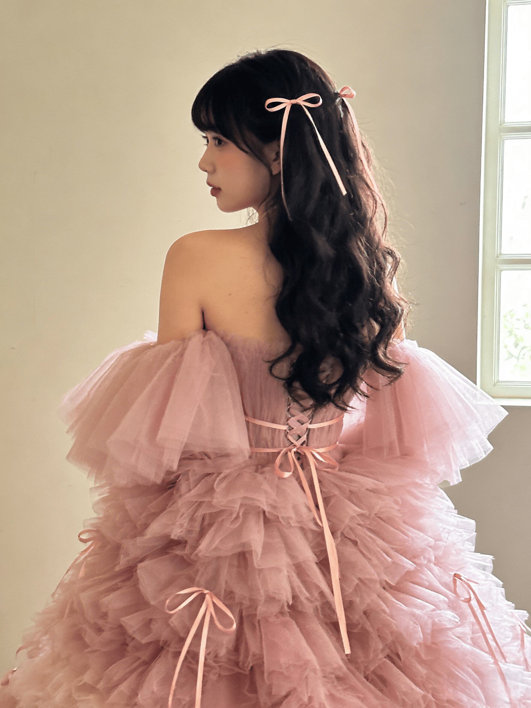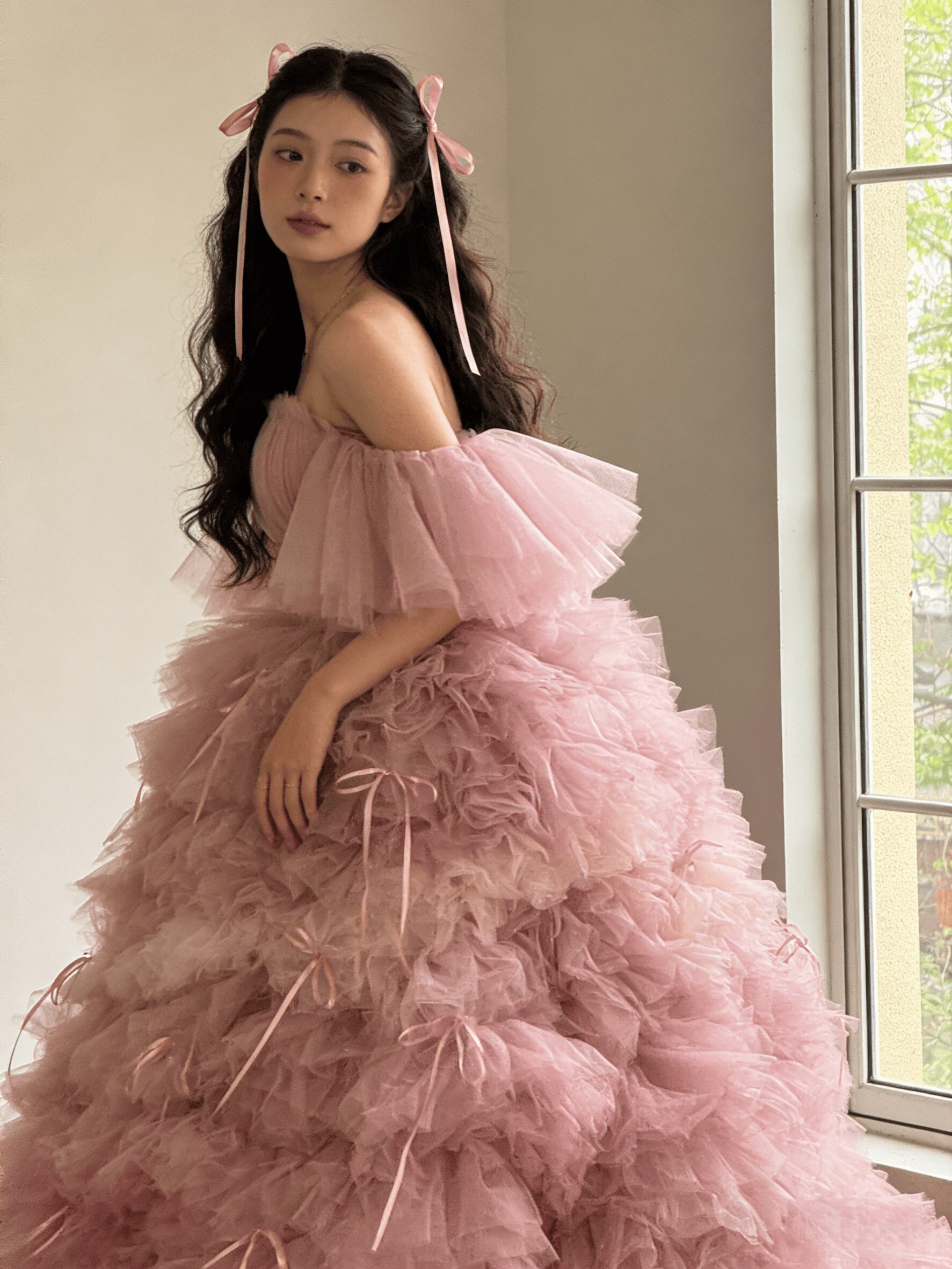 カラードレス ピンク リボン 3色 もこもこドレス 華やかなトレーン プリンセスライン 結婚式 前撮り