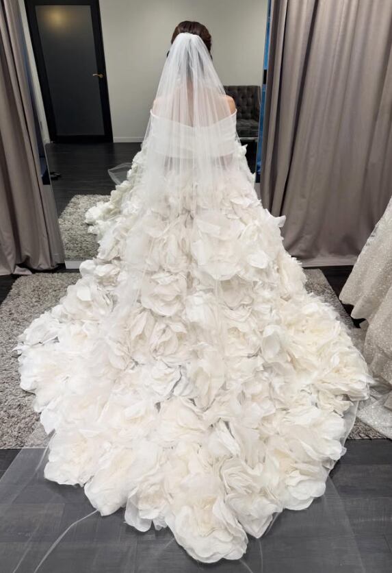 ウエディングドレス オフホワイト オフショルダー アシンメトリードレス 華やかなトレーン 韓国風ドレス 結婚式