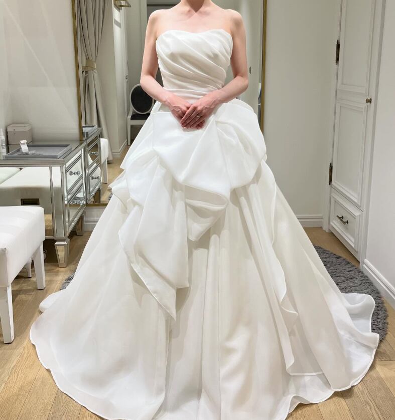 ウエディングドレス オフホワイト ビスチェドレス アシンメトリー風 上質オーガンジー ロングトレーン 結婚式