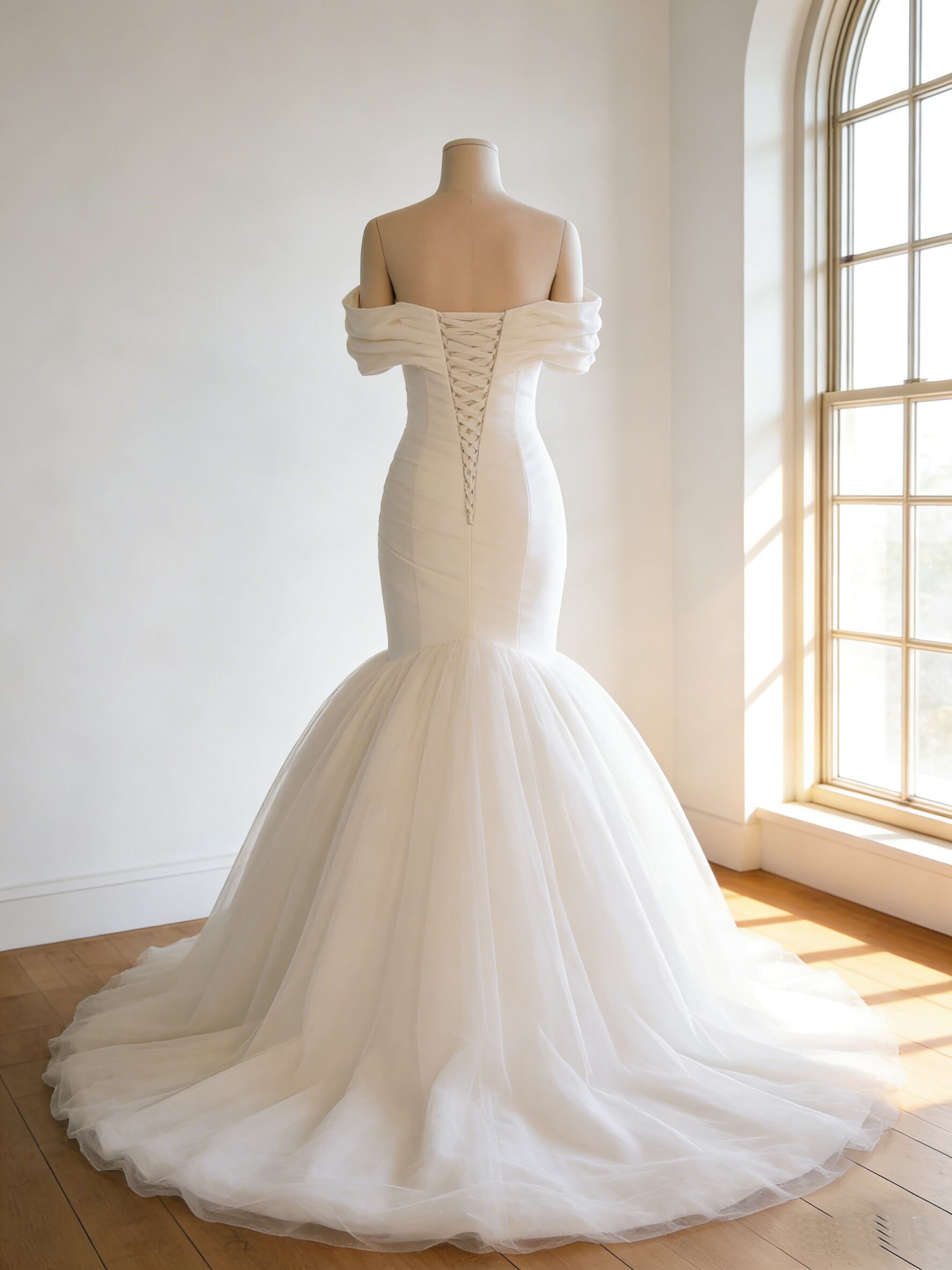 ウエディングドレス オフホワイト オフショルダー マーメイドライン トレーン ブライダル