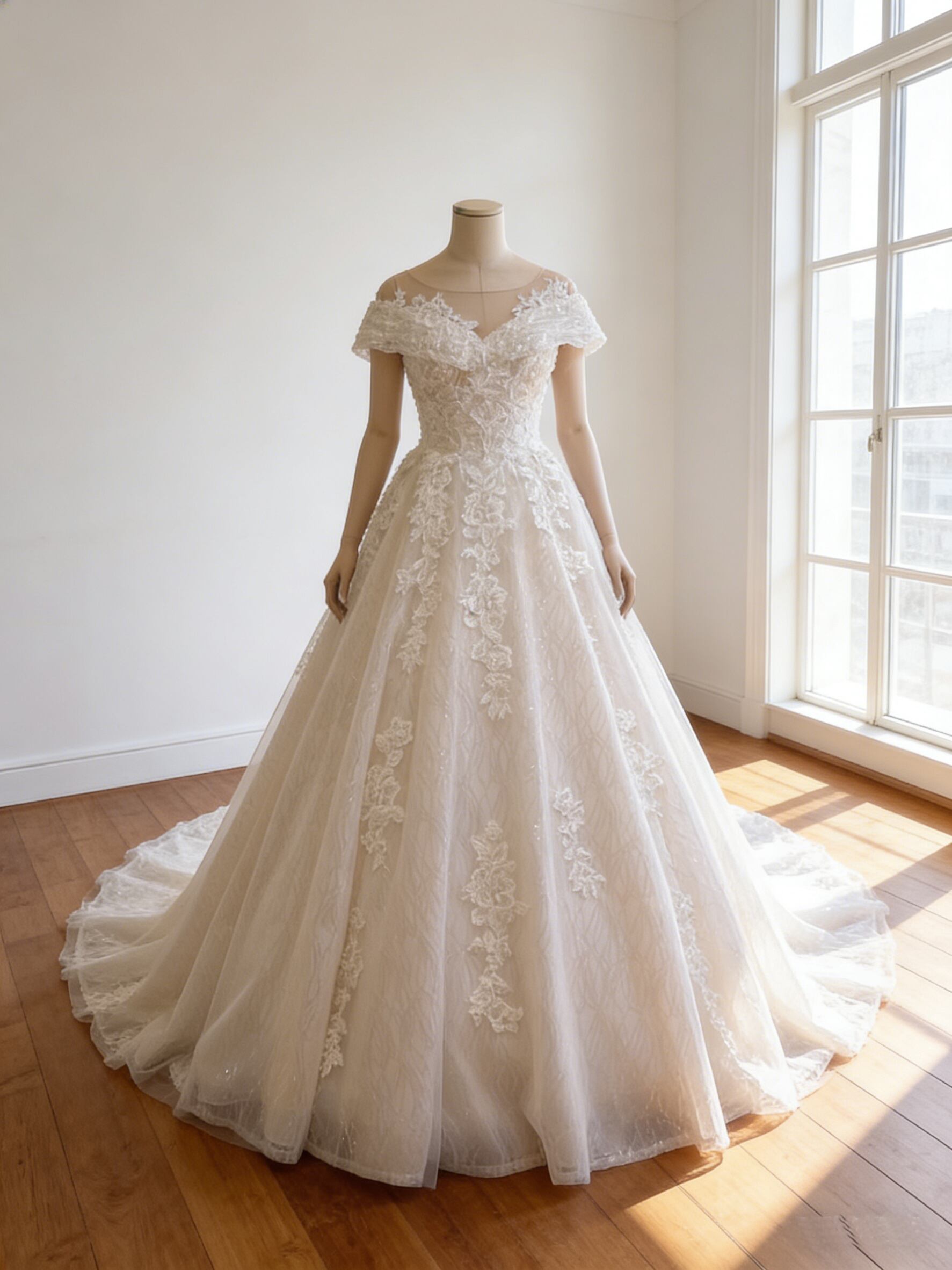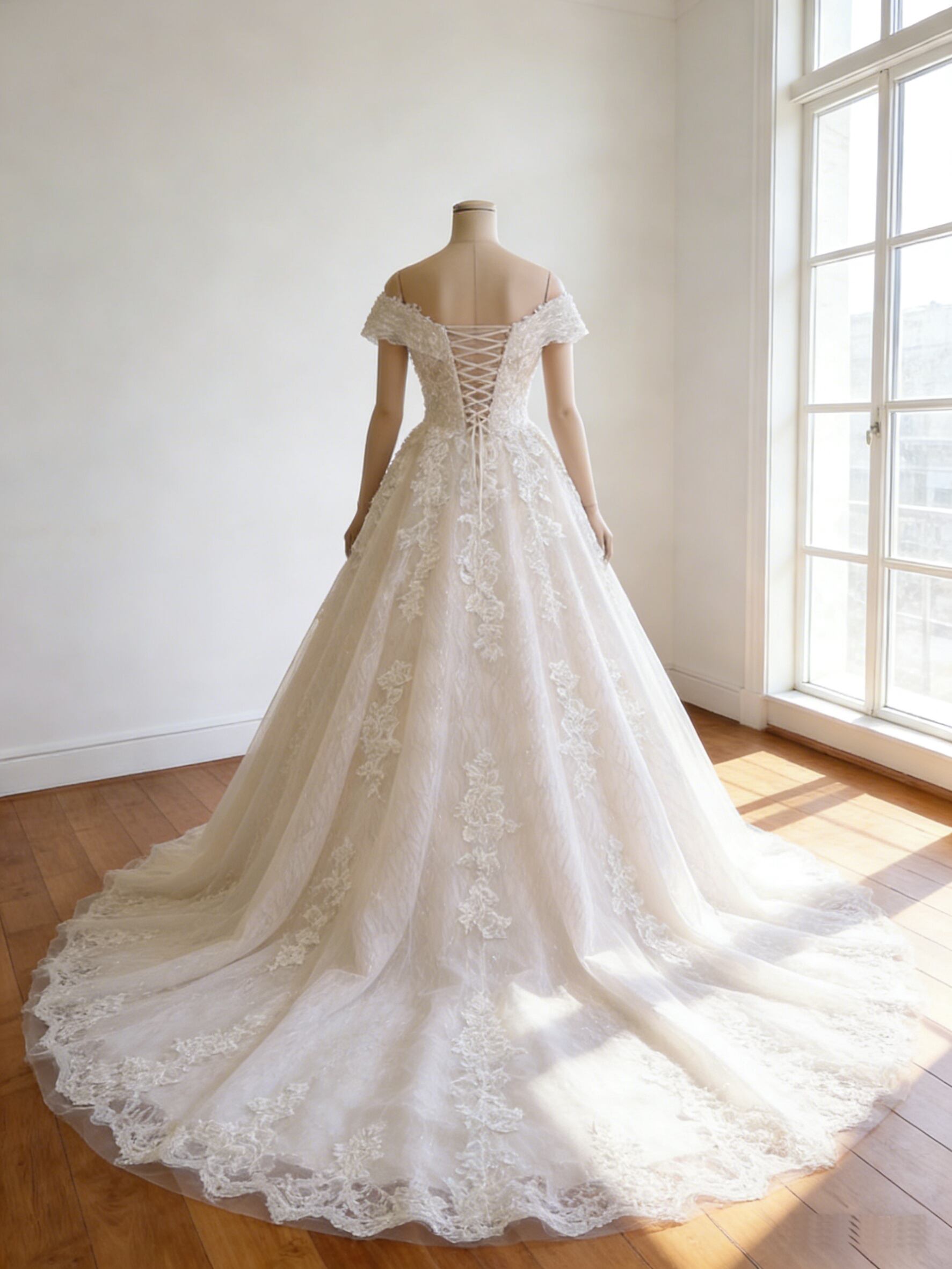 ウエディングドレス オフホワイト オフショルダー スカラップレース 編み上げ 華やかなトレーン 結婚式