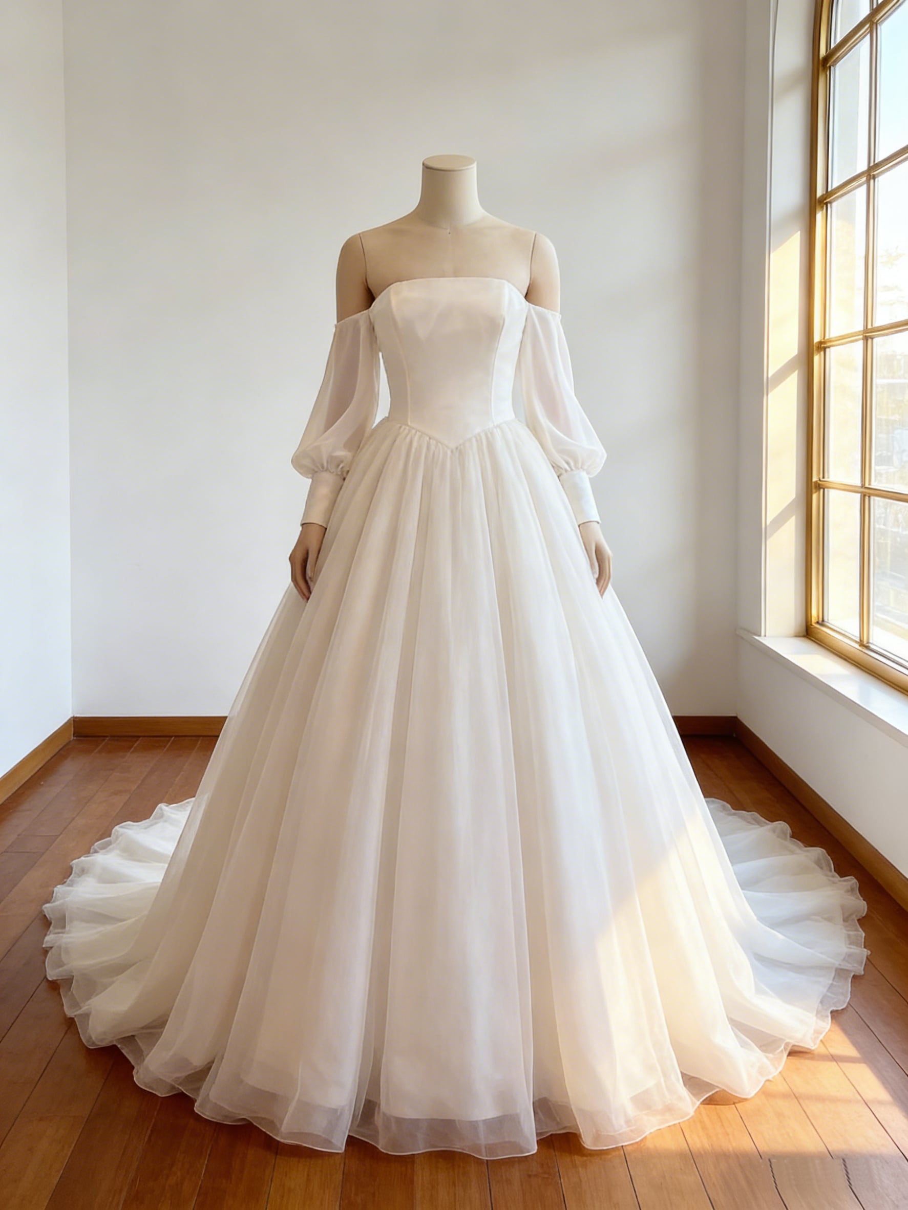 ウエディングドレス オフホワイト ロングスリーブ 編み上げ 華やかなトレーン 結婚式