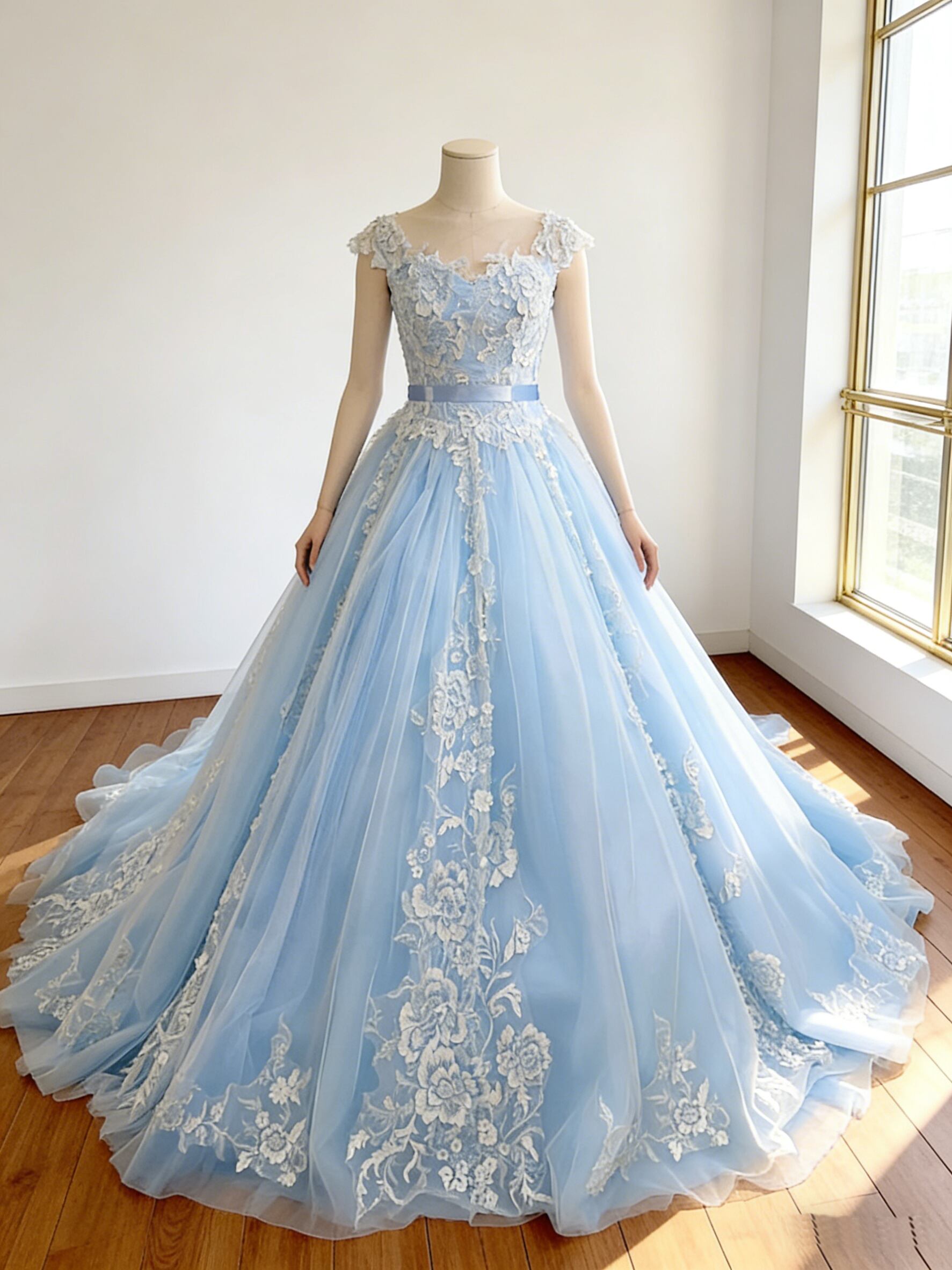 カラードレス 爽やかで優しいブルー 繊細なレース ノースリーブ 編み上げ 華やかなトレーン 結婚式