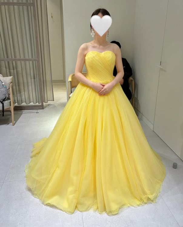 カラードレス パステルイエロー スリット サッシュベルト ソフトチュール ビスチェドレス 花嫁