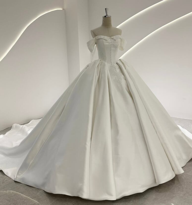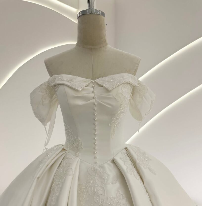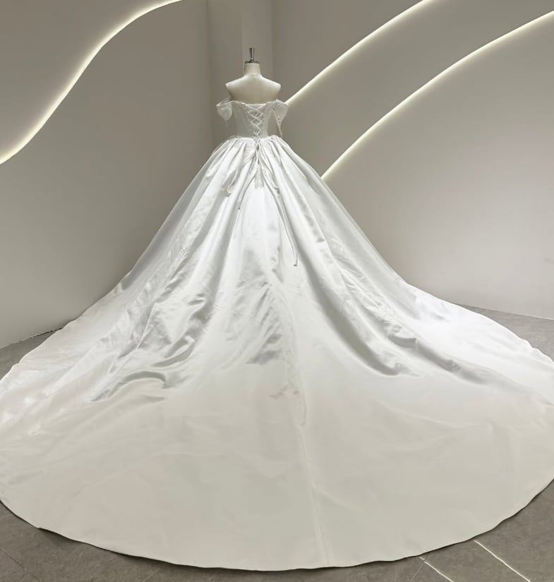 ウエディングドレス オフホワイト オフショルダー 繊細なレース 韓国風ドレス 華やかなトレーン 結婚式
