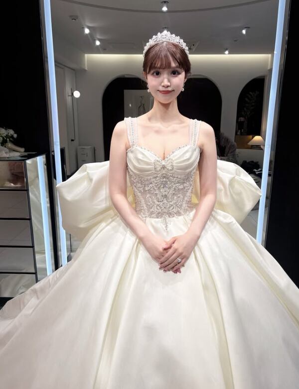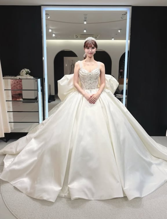 ウエディングドレス オフホワイト 韓国風ドレス ふっくら柔らかなバックリボン キャミソール 繊細なレース 華やかなトレーン ブライダル