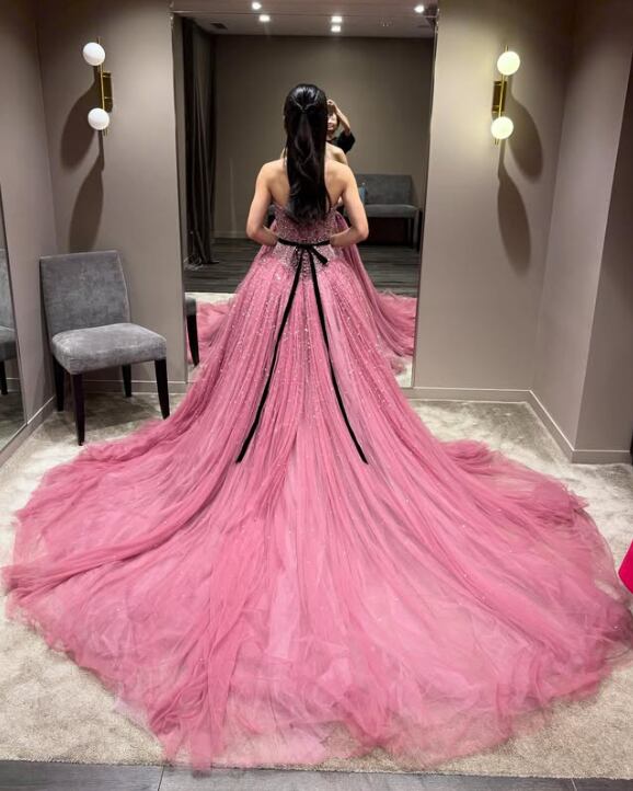 カラードレス ピンク シークインチュール ビスチェドレス サッシュベルト 華やかなトレーン 結婚式 前撮り