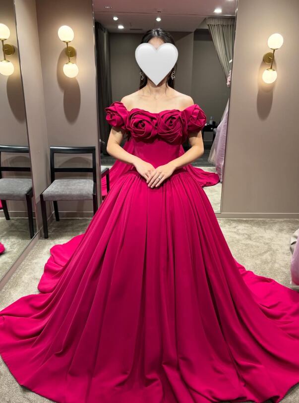 カラードレス ビビッドピンク フリルオフショルダー 華やかなトレーン マット生地 花嫁 前撮り