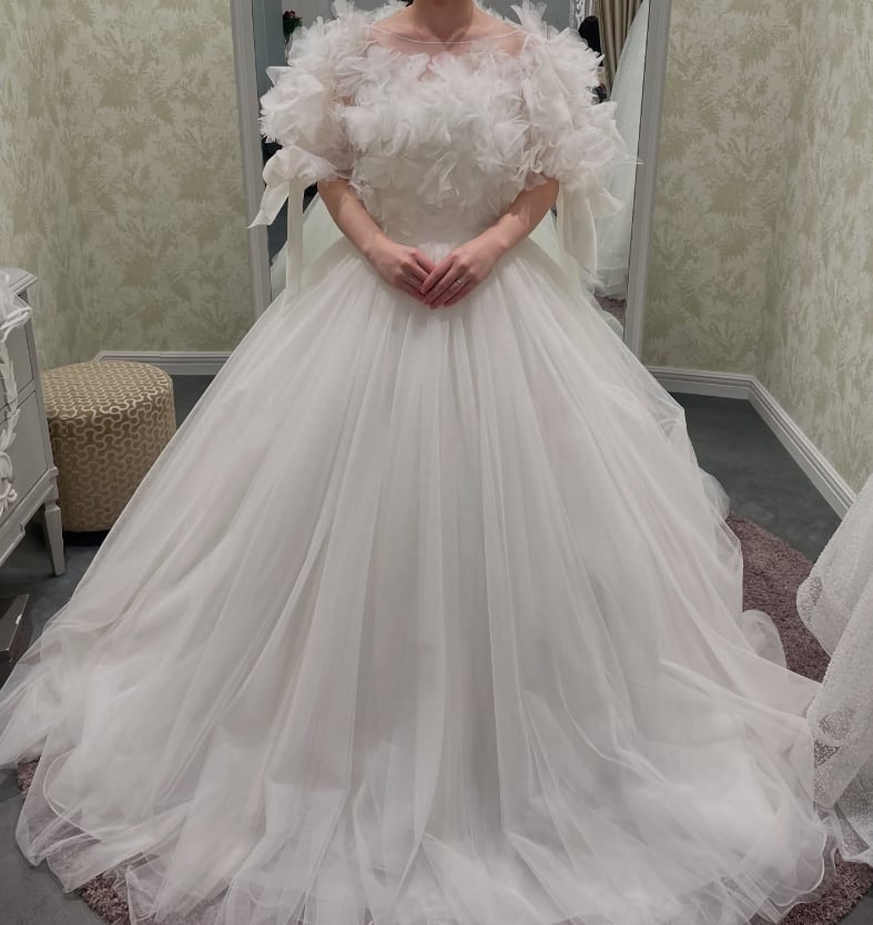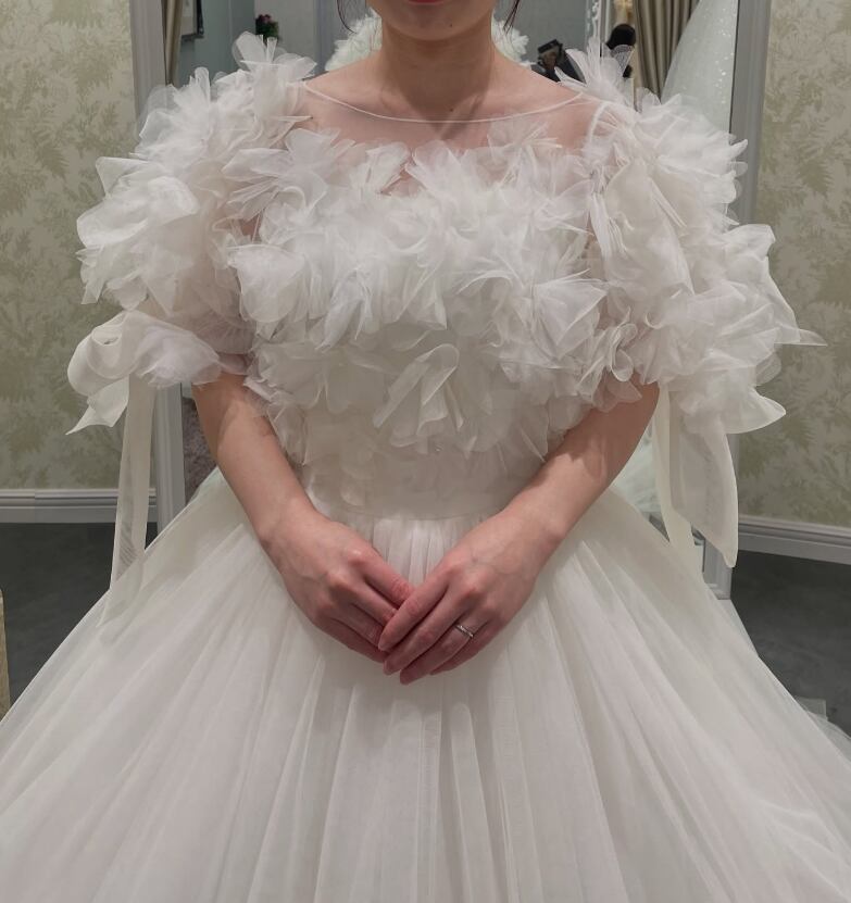 ウエディングドレス オフホワイト 柔らかく重ねたチュールスカート リボン トレーン ブライダル