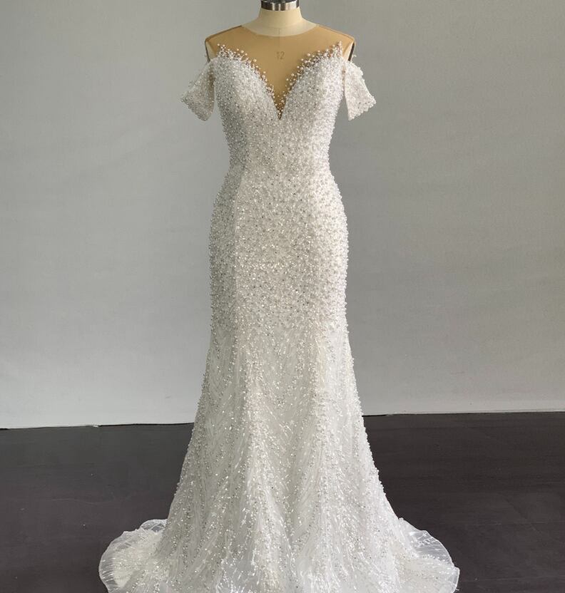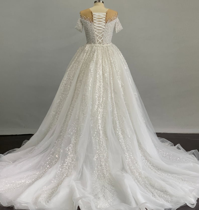 ウエディングドレス オフホワイト オフショルダー 韓国風ドレス キラキラのハンドビーディング 取り外し可能なロングトレーン 編み上げ ブライダル