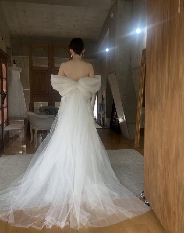 ウエディングドレス オフホワイト 花柄モチーフで刺繍が美しい ふっくら柔らかなバックリボン スレンダーライン 結婚式
