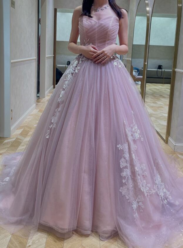 カラードレス ピンク 花柄モチーフで刺繍が美しい シークインチュール 編み上げ 華やかなトレーン ビスチェドレス 花嫁