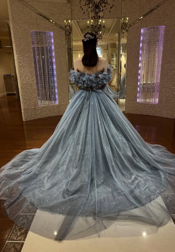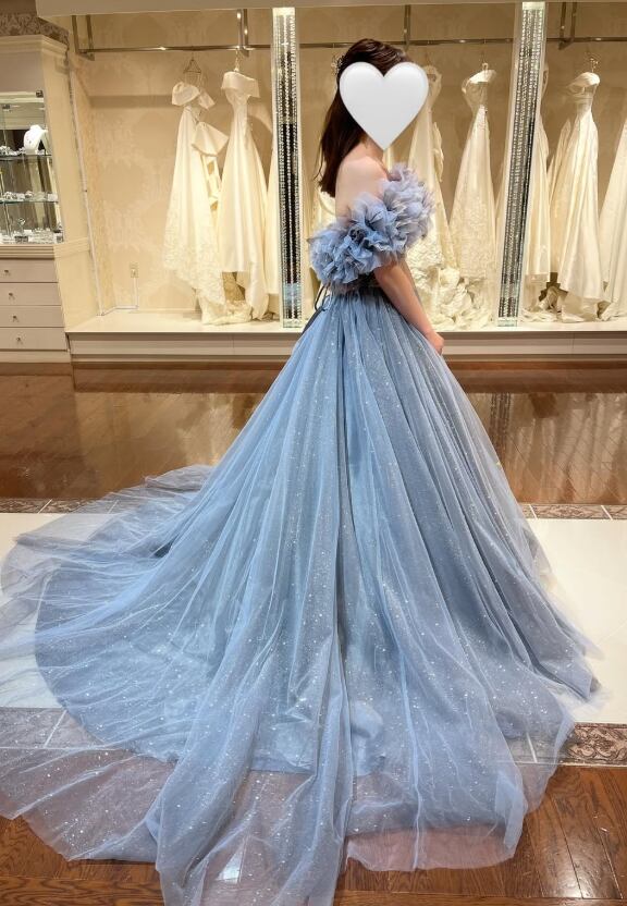 カラードレス 爽やかで優しいブルー オフショルダー シークインチュール 華やかなトレーン 花嫁 前撮り