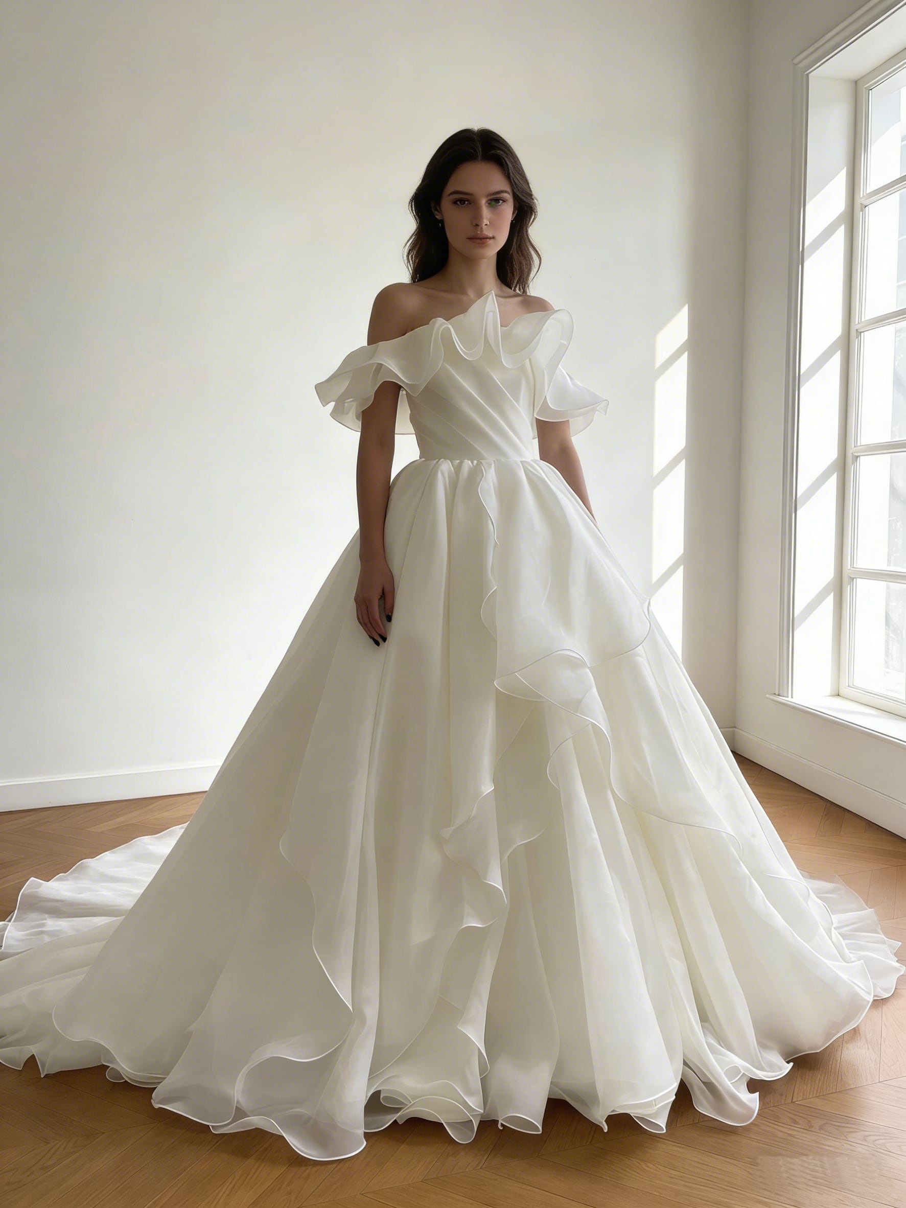 ウエディングドレス オフホワイト オフショルダー 上質オーガンジー 華やかなトレーン 編み上げ 結婚式